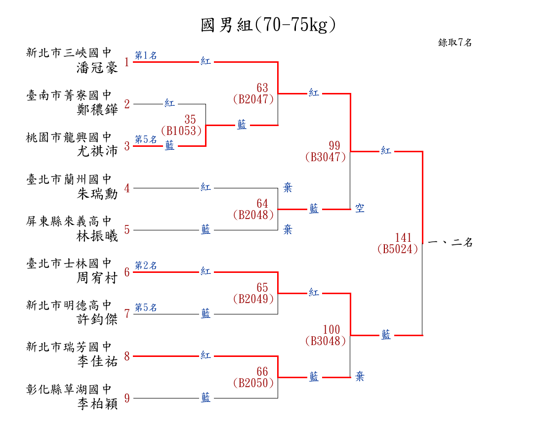 73國男組(70-75kg) ( 9取7 ) 圖 第 1 名[] 新北市三峽國中 {新北市三峽國中}潘冠豪