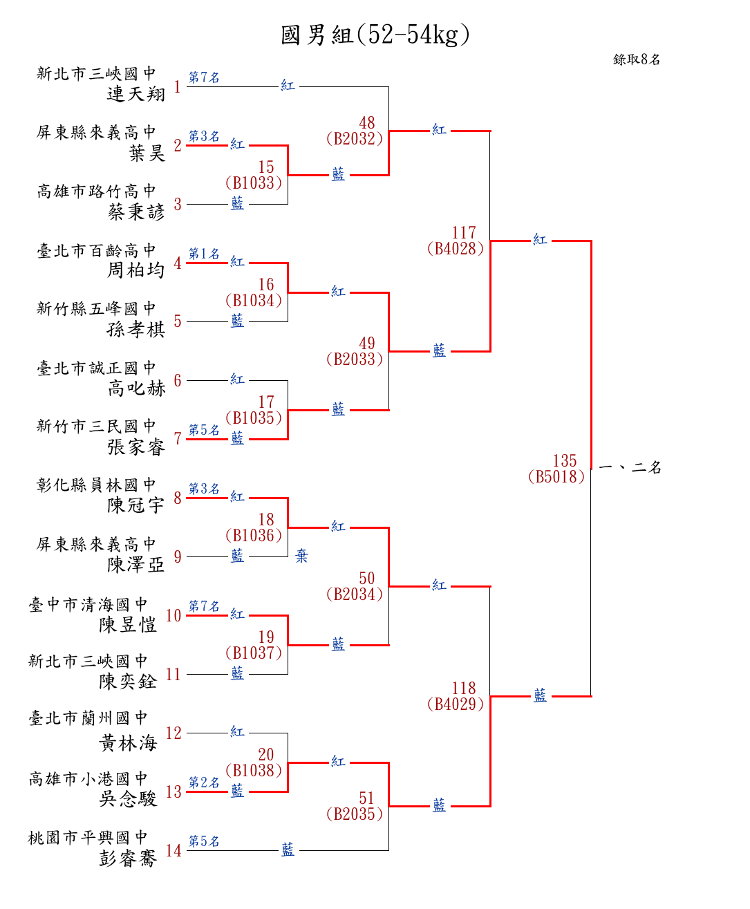 29國男組(52-54kg) ( 14取8 ) 圖 第 1 名[] 臺北市百齡高中 {臺北市百齡高中}周柏均