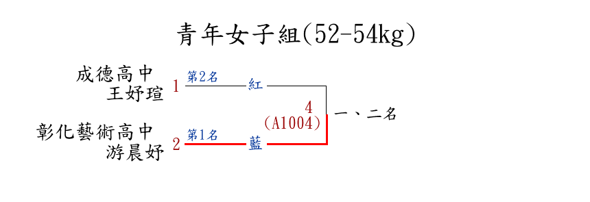 1青年女子組(46-48kg) ( 4取0 ) 圖 第 1 名[] 成德高中 {新竹市成德高中}郭怡萱