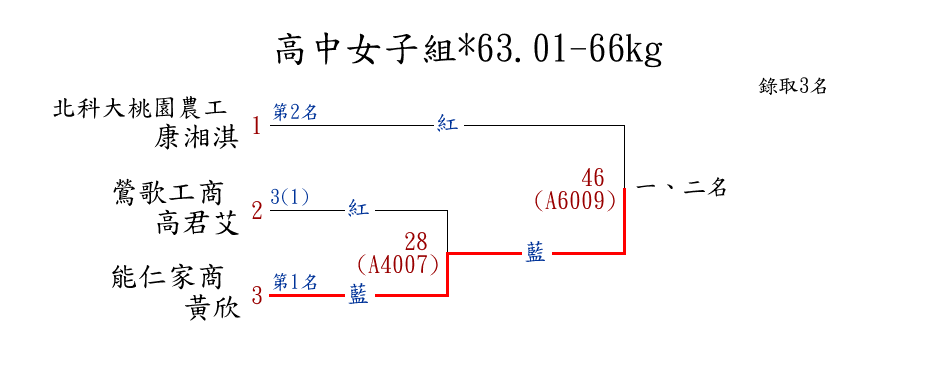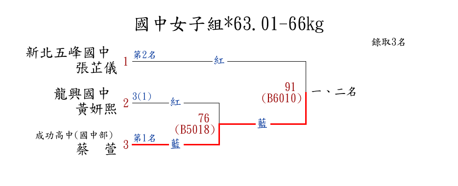 | 48 | 國中女子組*63.01-66㎏ ( 3取3 ) 圖 | 第 1 名 | [] 成功高中(國中部) {彰化縣立成功高中(國中部)} | 蔡䕒萱 | |