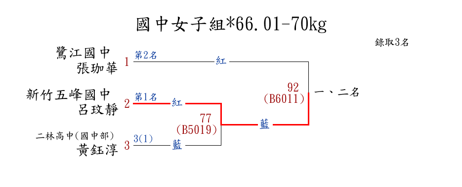 | 51 | 國中女子組*66.01-70㎏ ( 3取3 ) 圖 | 第 1 名 | [] 新竹五峰國中 {新竹縣立五峰國民中學} | 呂玟靜 | |