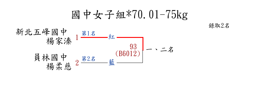 | 54 | 國中女子組*70.01-75kg ( 2取2 ) 圖 | 第 1 名 | [] 新北五峰國中 {新北市五峰國中} | 楊家溱 | |