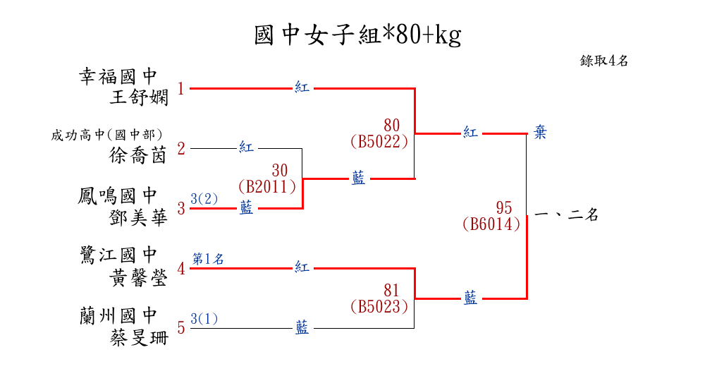 | 60 | 國中女子組*80+kg ( 5取4 ) 圖 | 第 1 名 | [] 鷺江國中 {鷺江國中} | 黃馨瑩 | |