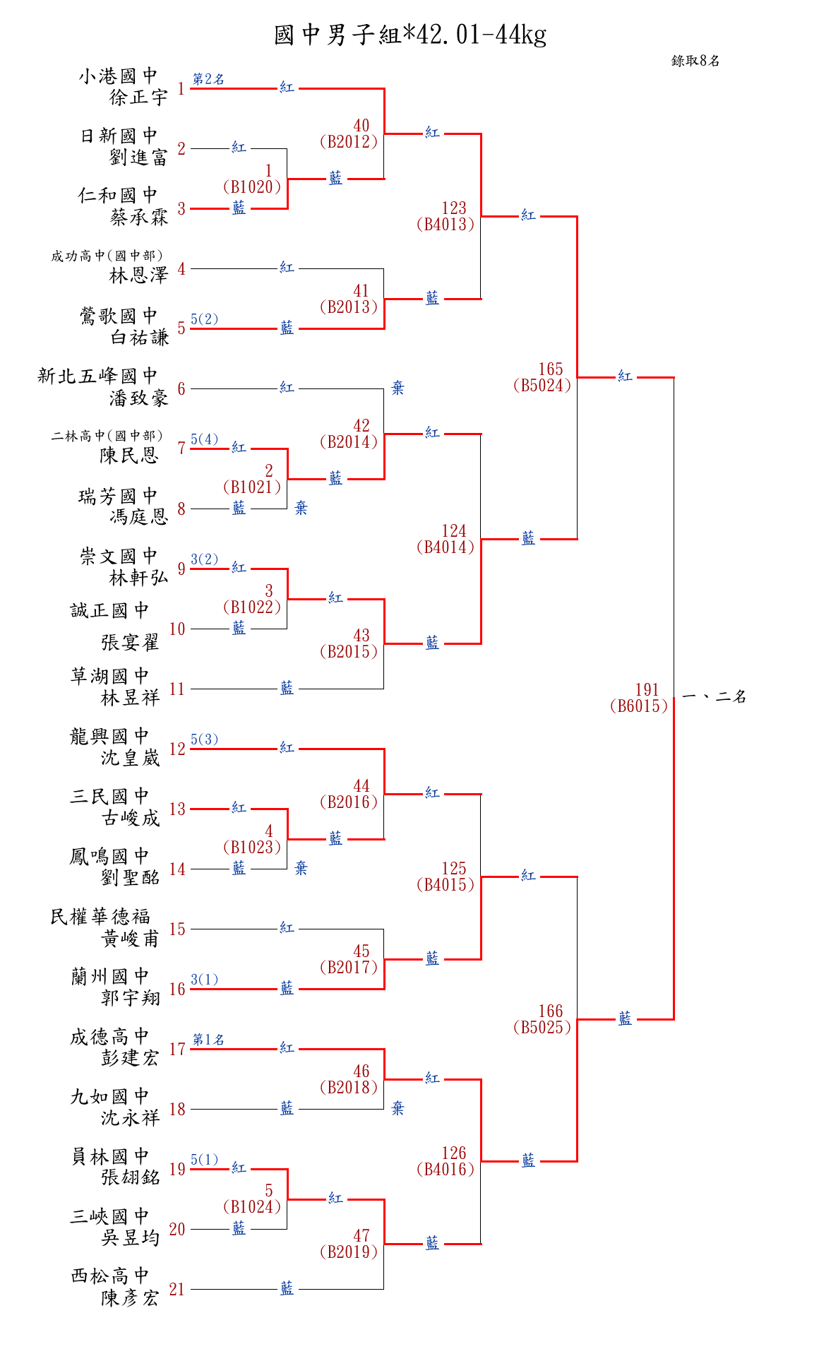 | 63 | 國中男子組*42.01-44㎏ ( 21取8 ) 圖 | 第 1 名 | [] 成德高中 {新竹市立成德高中} | 彭建宏 | |