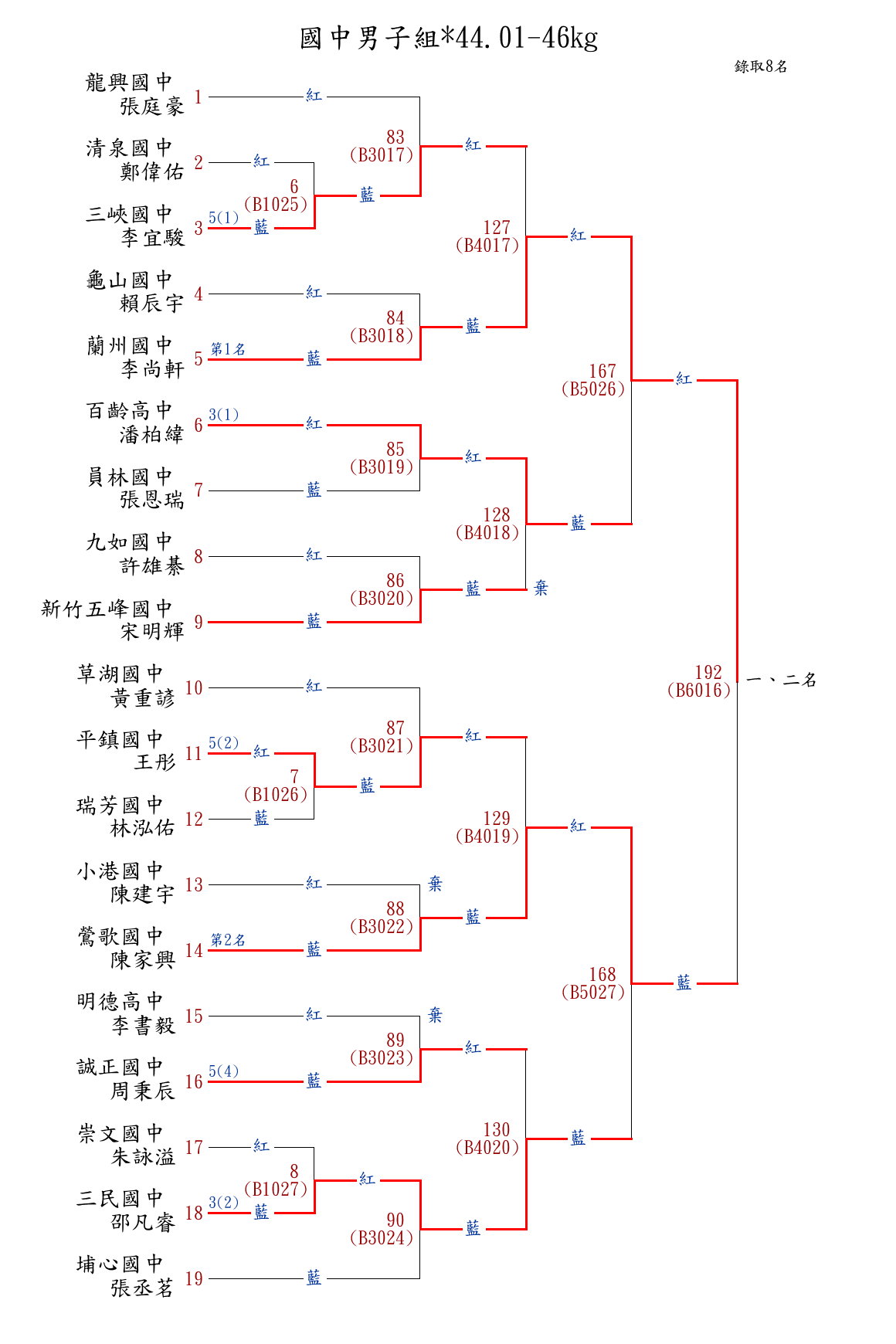| 71 | 國中男子組*44.01-46㎏ ( 19取8 ) 圖 | 第 1 名 | [] 蘭州國中 {臺北市立蘭州國民中學} | 李尚軒 | |