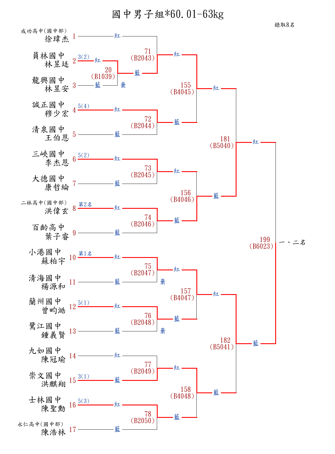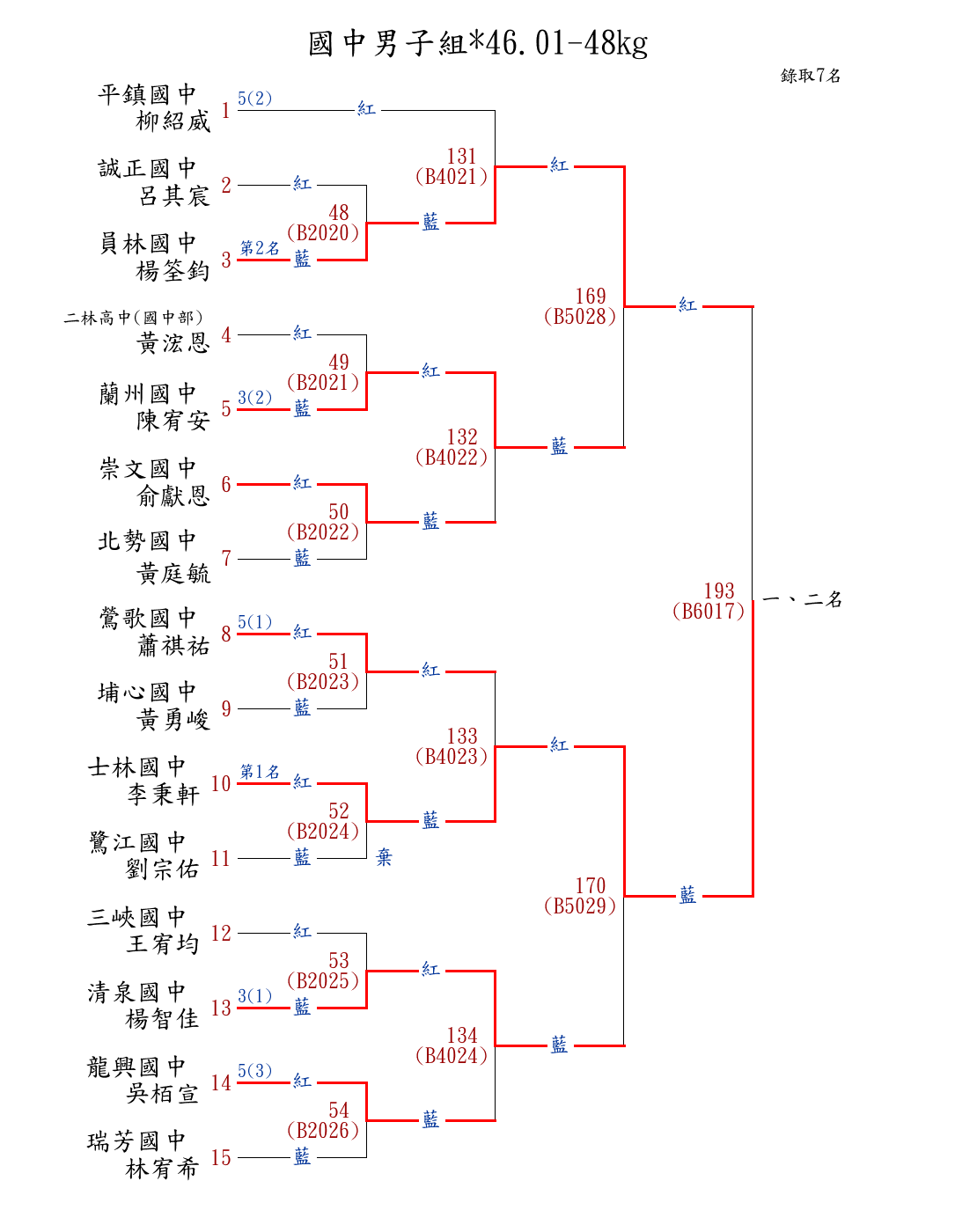 | 78 | 國中男子組*46.01-48㎏ ( 15取7 ) 圖 | 第 1 名 | [] 士林國中 {臺北市士林國中} | 李秉軒 | |