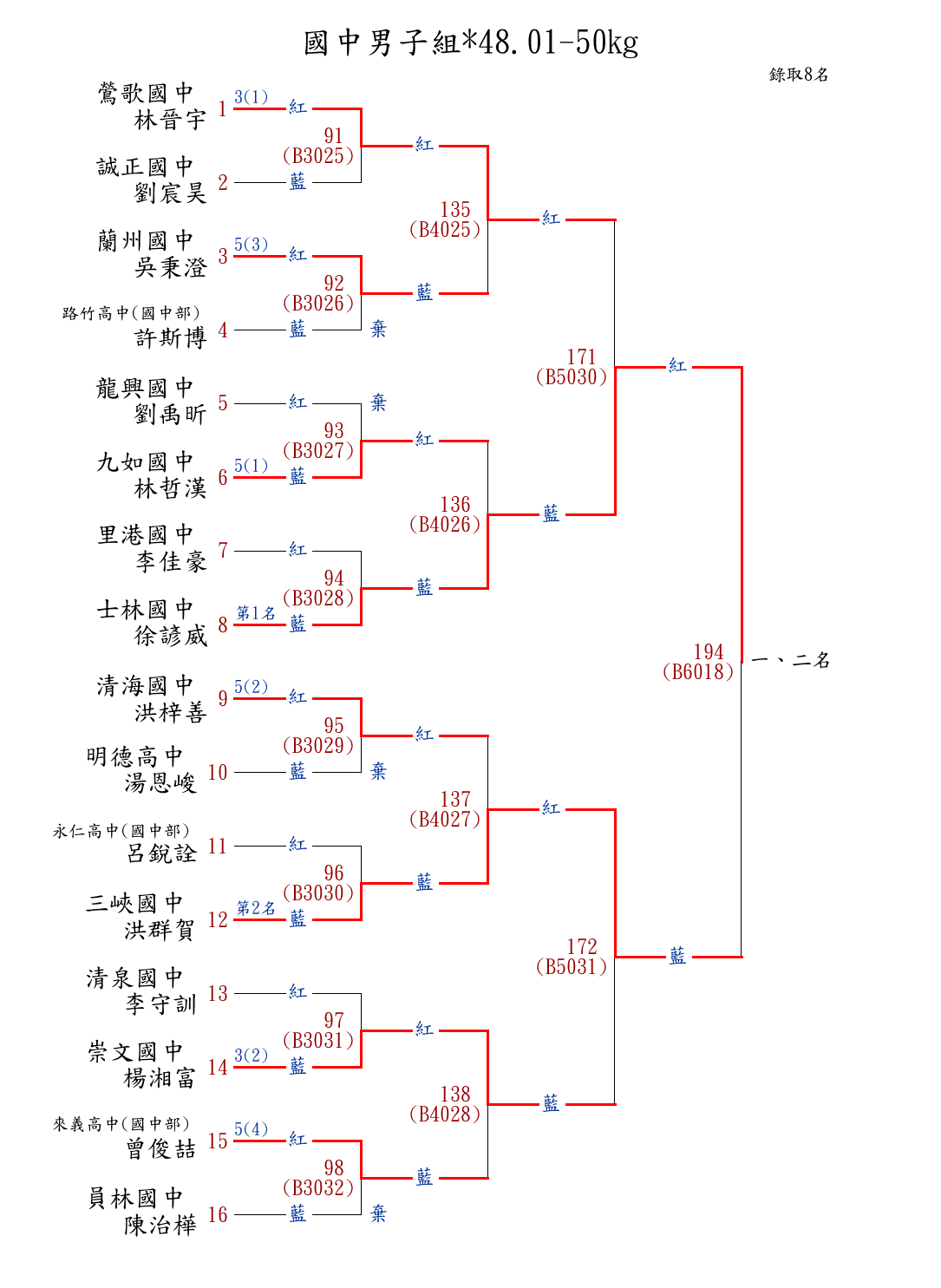 | 85 | 國中男子組*48.01-50㎏ ( 16取8 ) 圖 | 第 1 名 | [] 士林國中 {臺北市士林國中} | 徐諺威 | |