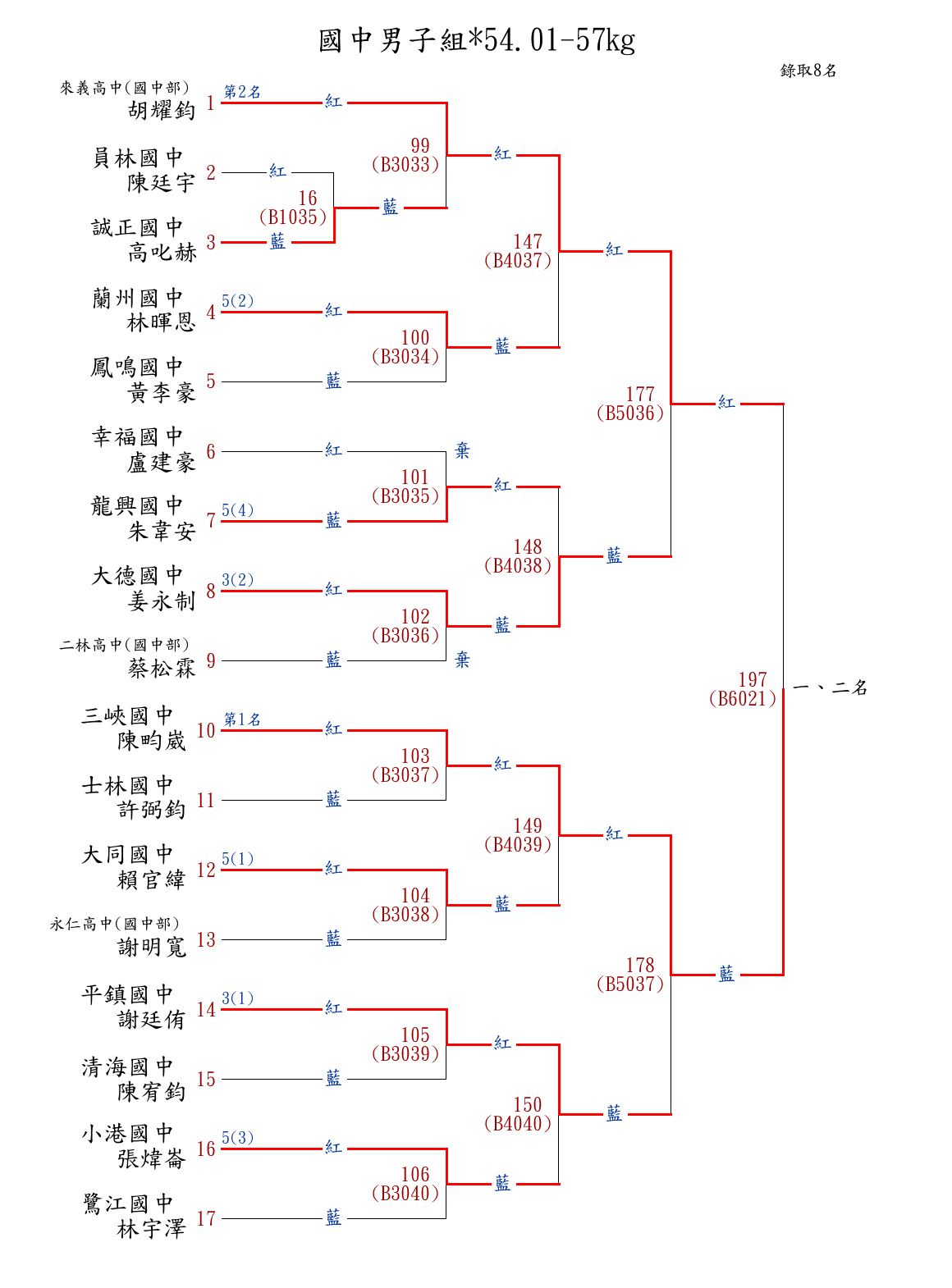 | 93 | 國中男子組*50.01-52㎏ ( 17取8 ) 圖 | 第 1 名 | [] 員林國中 {彰化縣立員林國民中學} | 賴冠珉 | |