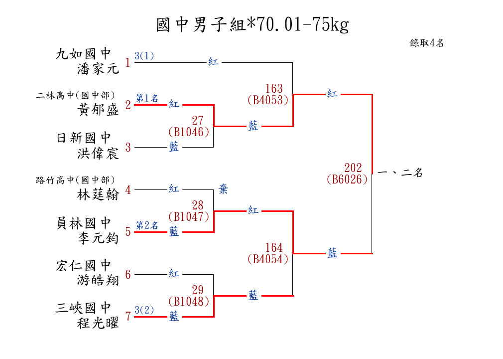 | 255 | 高中男子組*71.01-75kg ( 9取5 ) 圖 | 第 1 名 | [] 明德高中 {新北市立明德高中} | 潘冠豪 | |