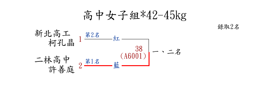 | 1 | 國中女子組*42.01-44㎏ ( 9取4 ) 圖 | 第 1 名 | [] 鳳鳴國中 {新北市立鳳鳴國民中學} | 吳宜蓁 | |