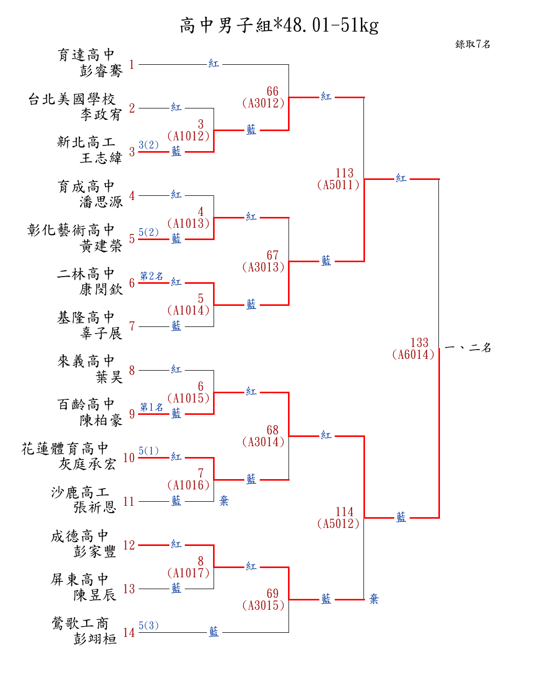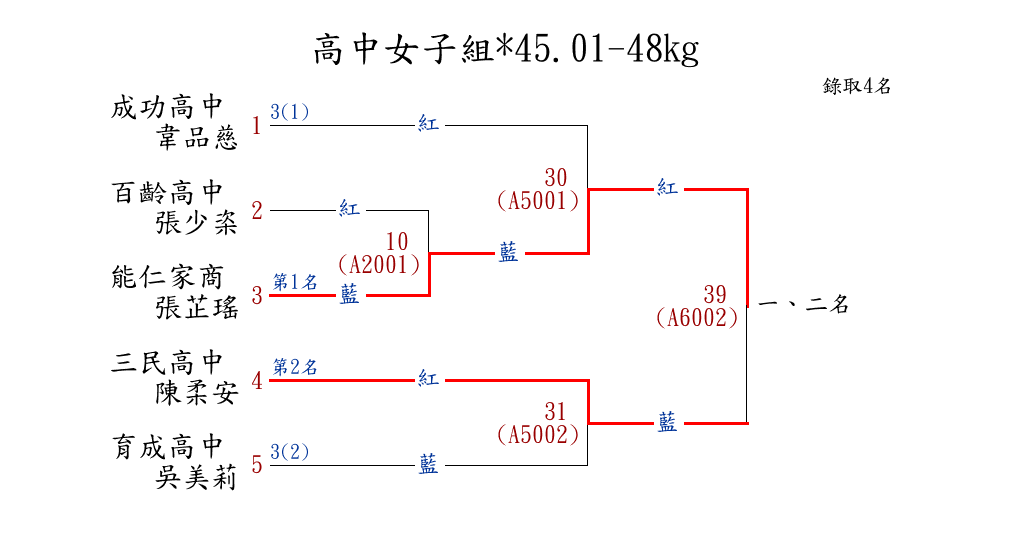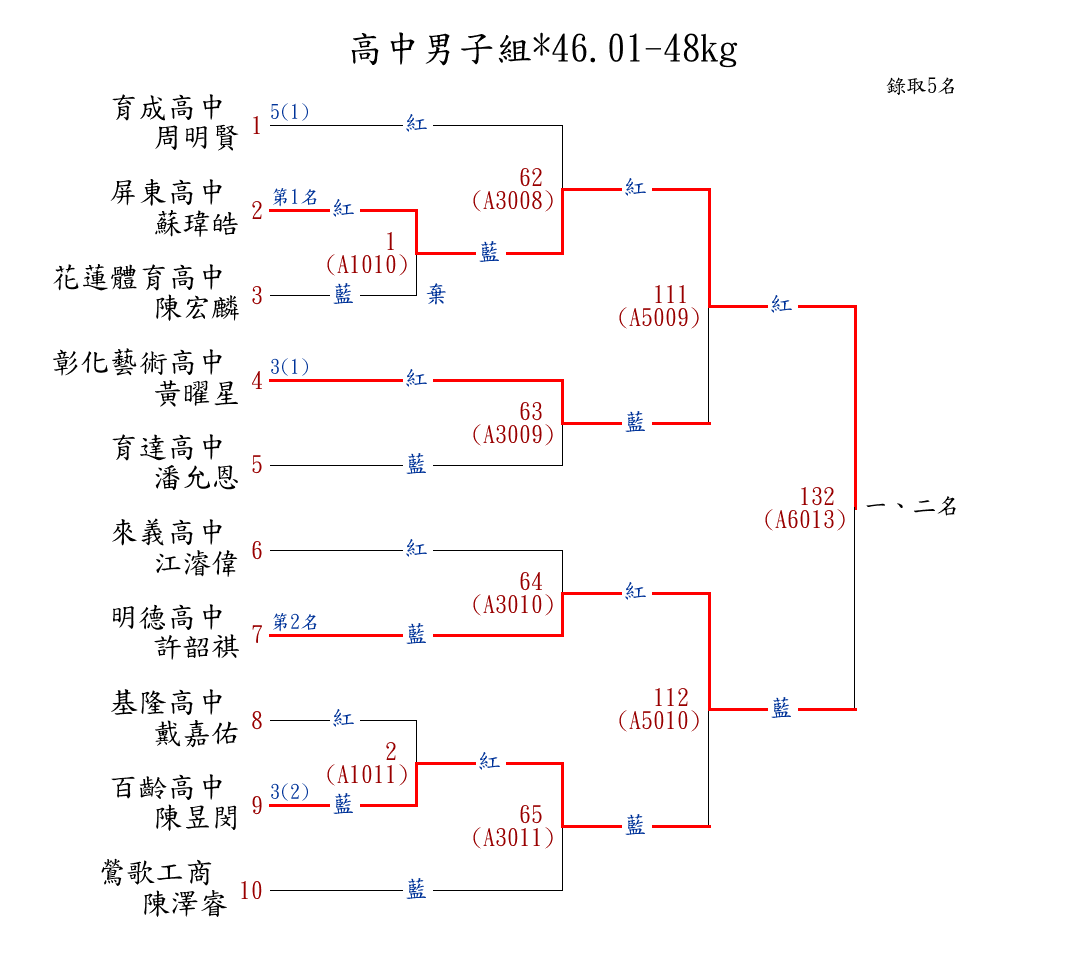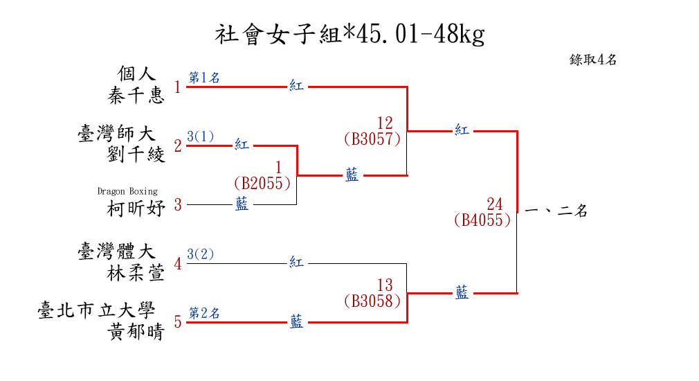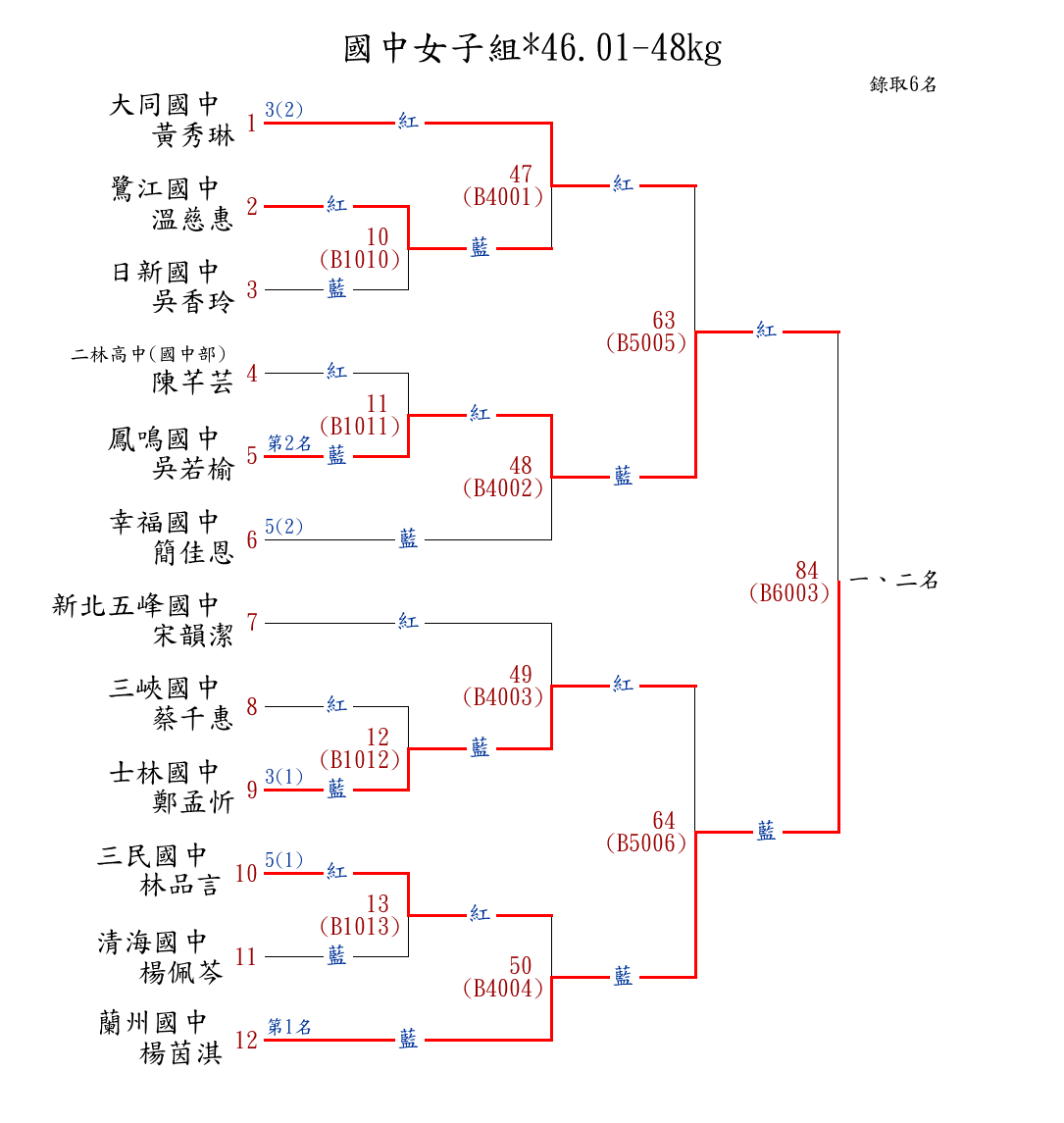 | 13 | 國中女子組*46.01-48㎏ ( 12取6 ) 圖 | 第 1 名 | [] 蘭州國中 {臺北市立蘭州國民中學} | 楊茵淇 | |