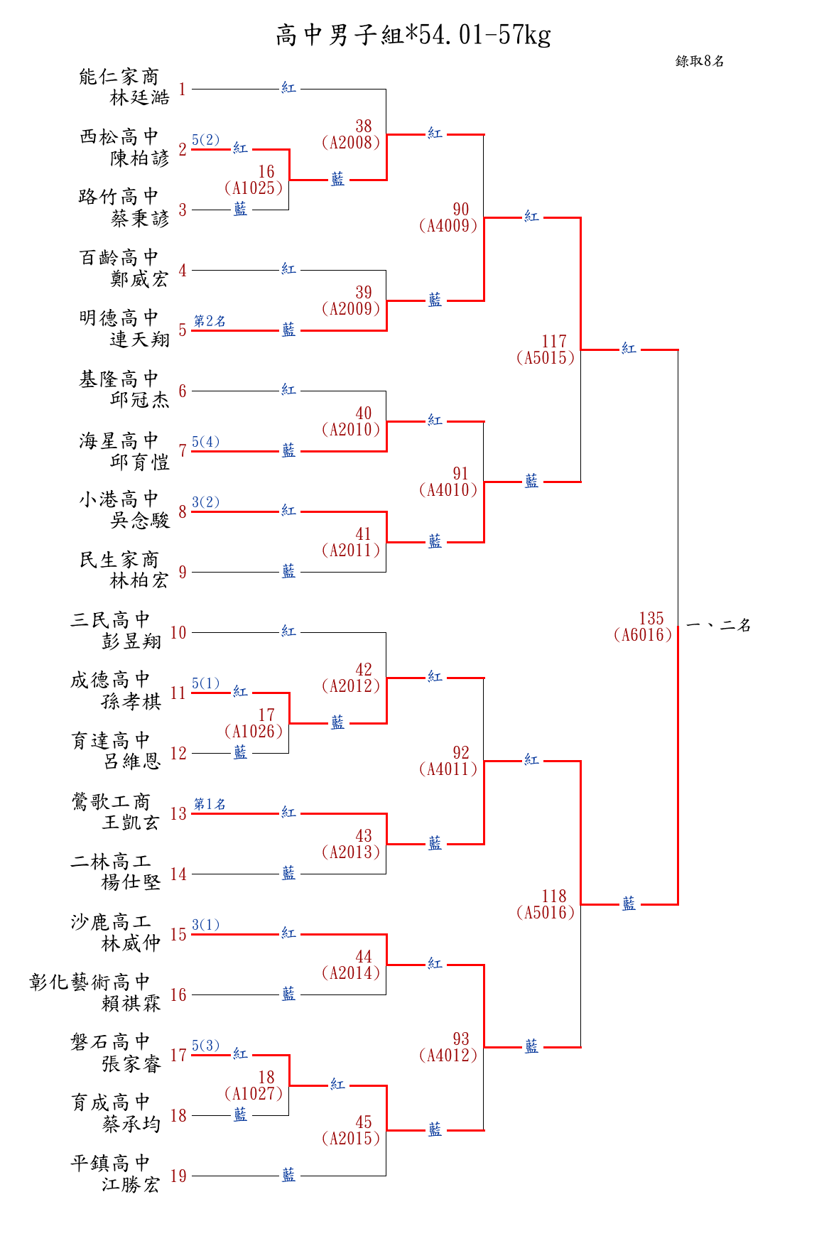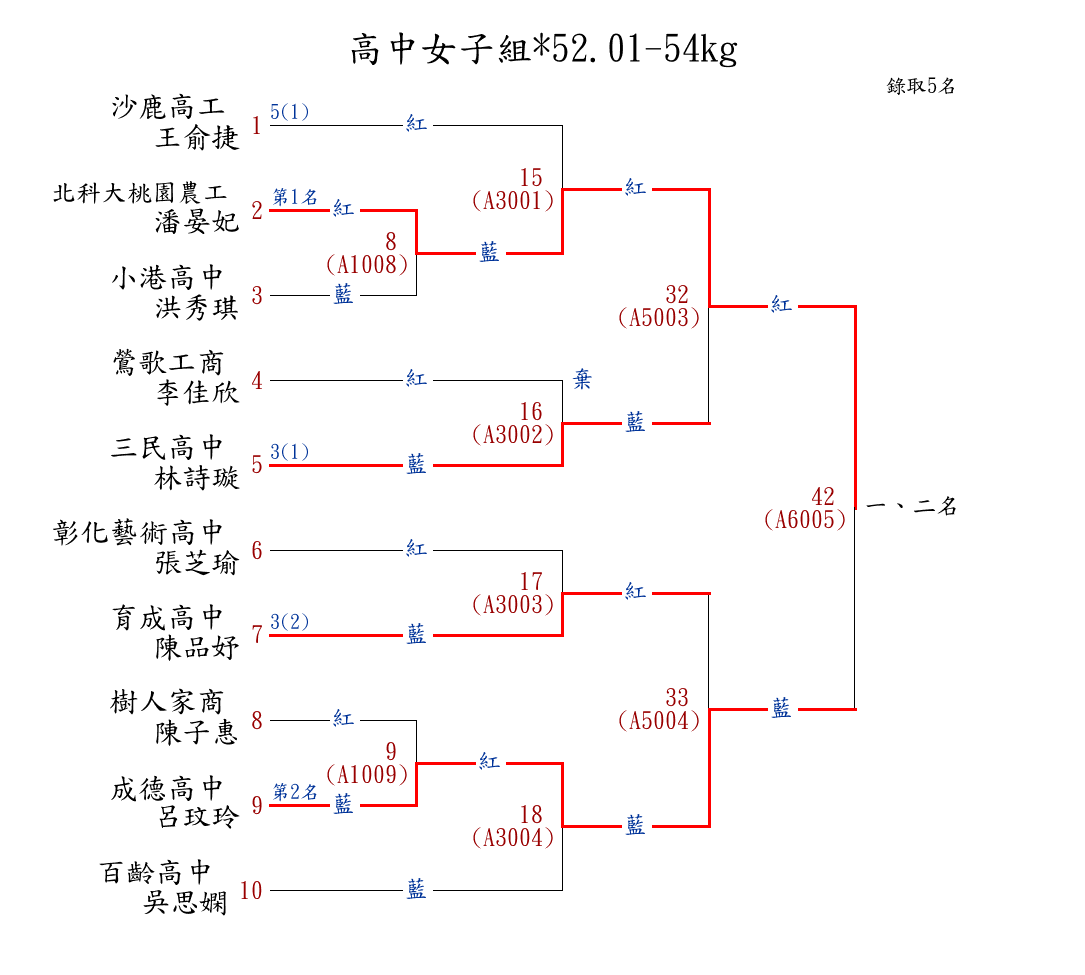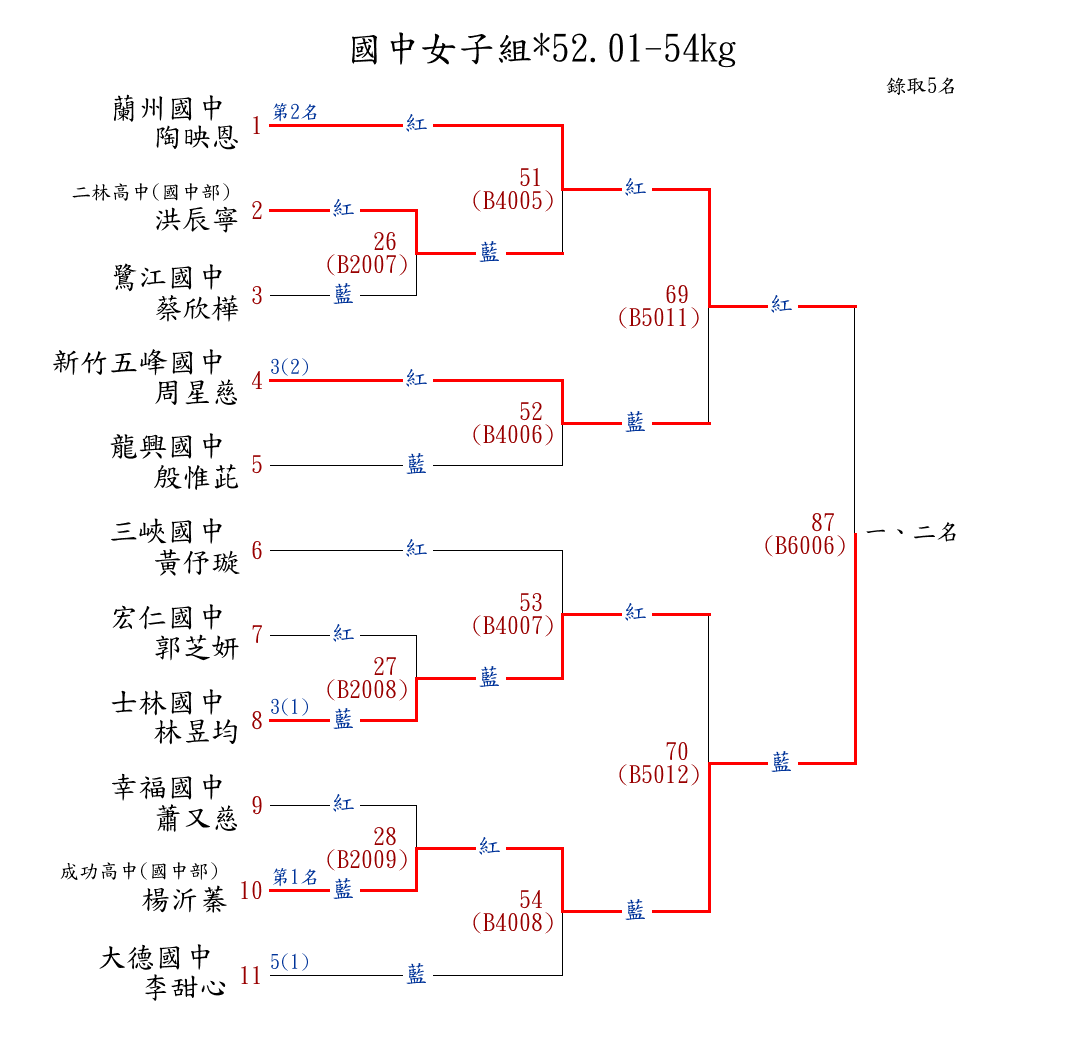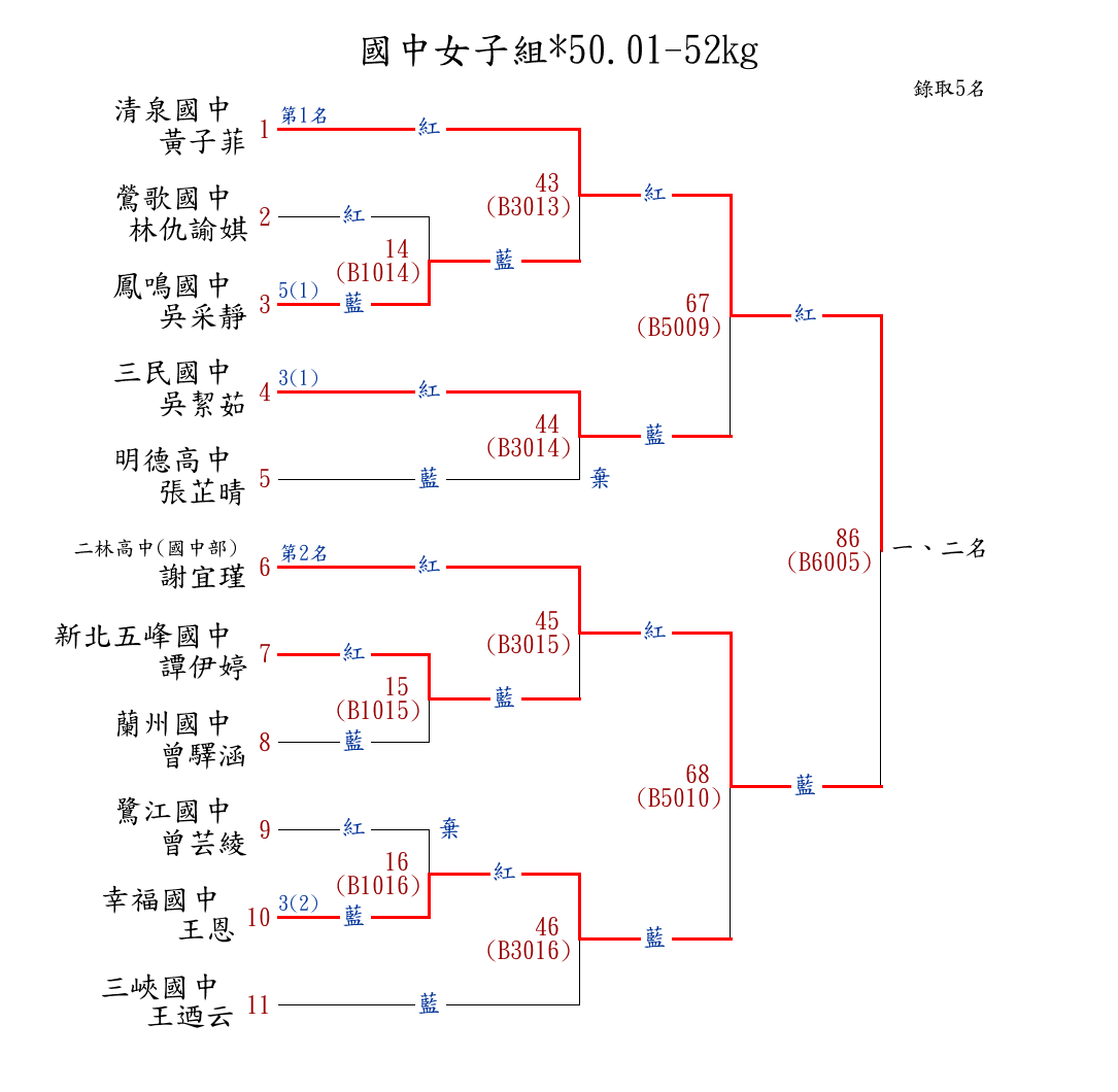 | 31 | 國中女子組*52.01-54㎏ ( 11取5 ) 圖 | 第 1 名 | [] 成功高中(國中部) {彰化縣立成功高中(國中部)} | 楊沂蓁 | |