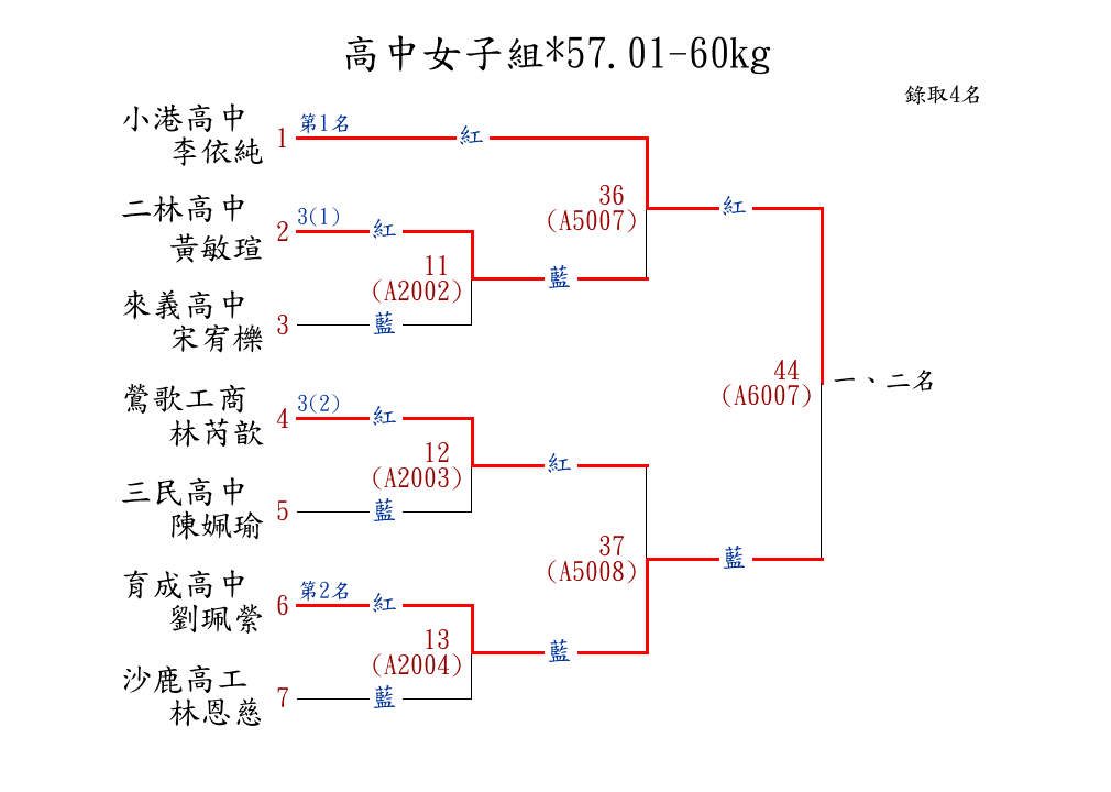 | 41 | 國中女子組*57.01-60㎏ ( 3取3 ) 圖 | 第 1 名 | [] 三峽國中 {新北市三峽國中} | 林莉君 | |