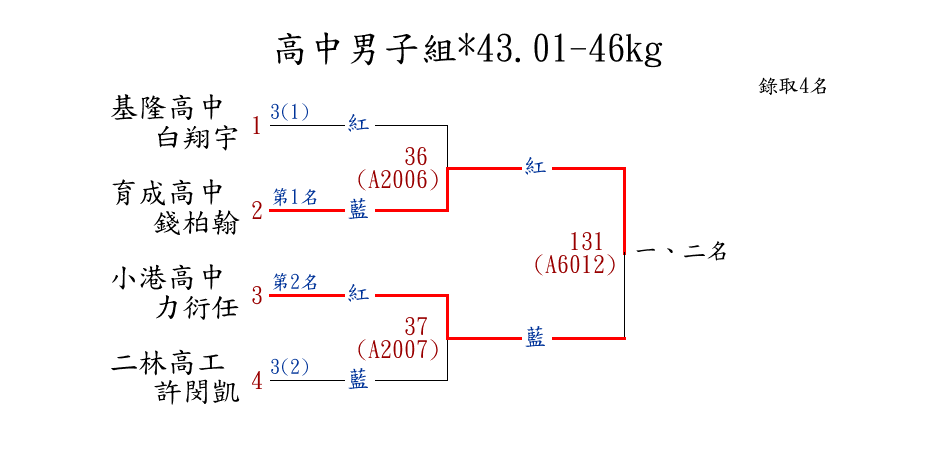 | 5 | 國中女子組*44.01-46㎏ ( 16取8 ) 圖 | 第 1 名 | [] 三民國中 {新竹市立三民國中} | 陳芳榆 | |