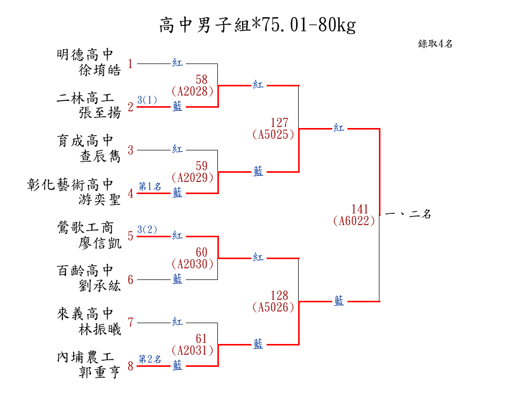 | 260 | 高中男子組*75.01-80kg ( 8取4 ) 圖 | 第 1 名 | [] 彰化藝術高中 {彰化藝術高級中學} | 游奕聖 | |