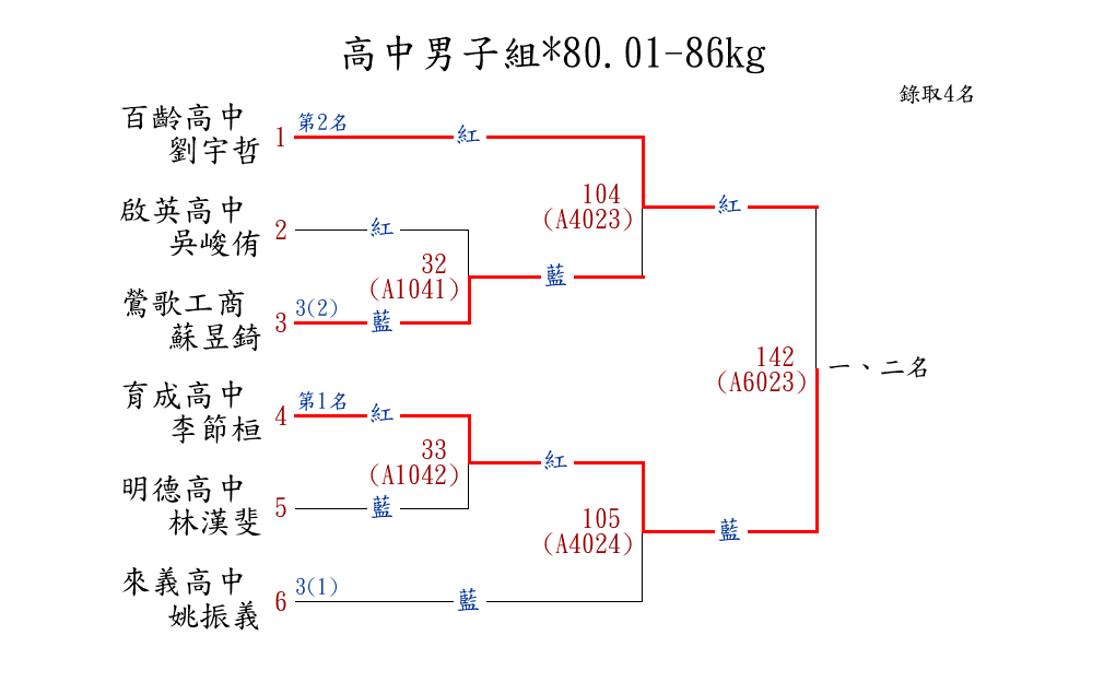 | 264 | 高中男子組*80.01-86kg ( 6取4 ) 圖 | 第 1 名 | [] 育成高中 {育成高中} | 李節桓 | |
