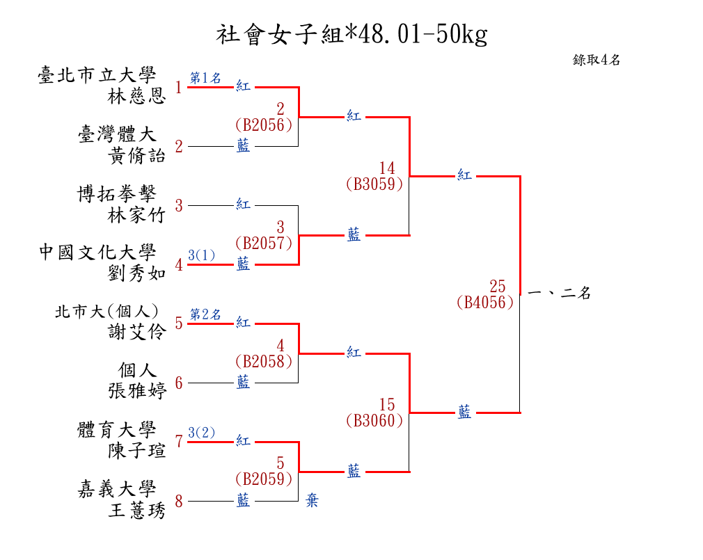 | 280 | 社會女子組*48.01-50kg ( 8取4 ) 圖 | 第 1 名 | [] 臺北市立大學 {臺北市立大學} | 林慈恩 | |