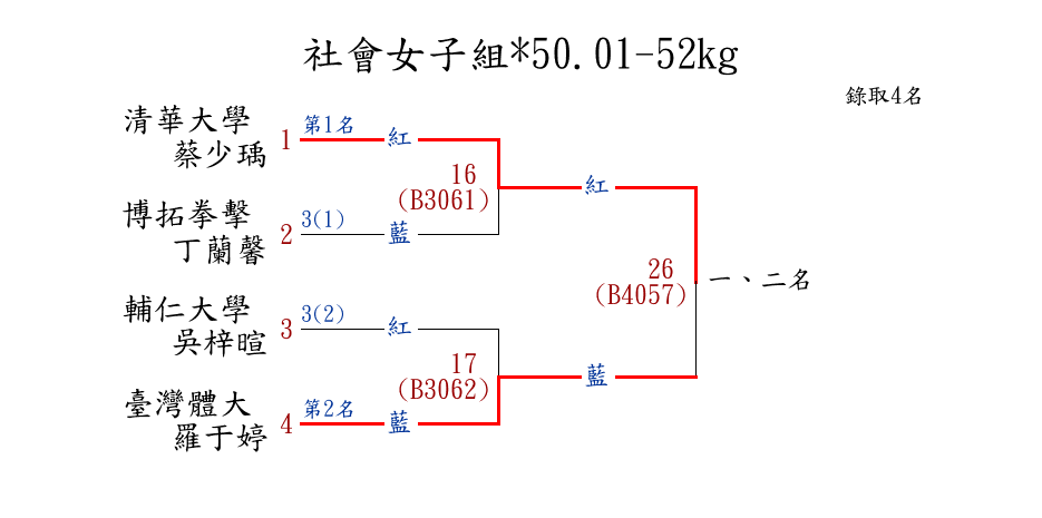 | 284 | 社會女子組*50.01-52kg ( 4取4 ) 圖 | 第 1 名 | [] 清華大學 {國立清華大學} | 蔡少瑀 | |