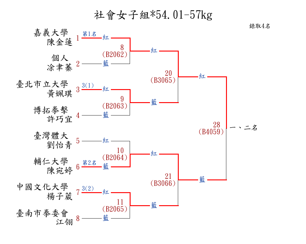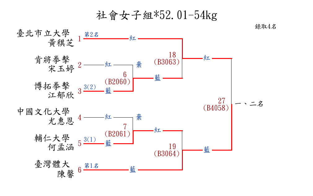 | 288 | 社會女子組*52.01-54kg ( 6取4 ) 圖 | 第 1 名 | [] 臺灣體大 {國立臺灣體育運動大學} | 陳馨 | |
