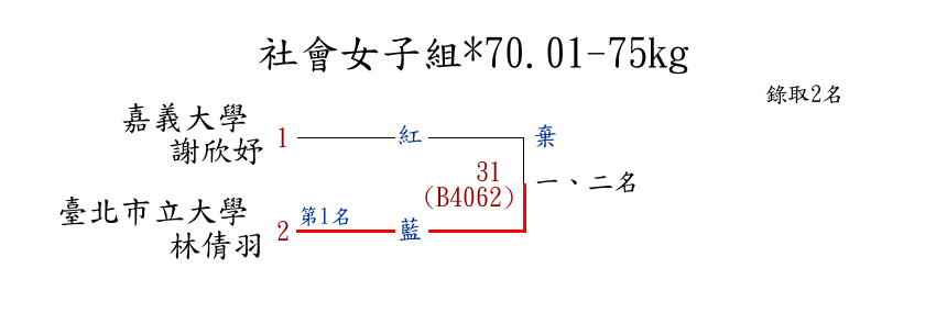 | 300 | 社會女子組*70.01-75kg ( 2取2 ) 圖 | 第 1 名 | [] 臺北市立大學 {臺北市立大學} | 林倩羽 | |