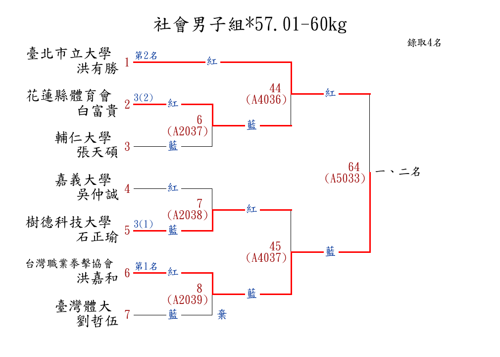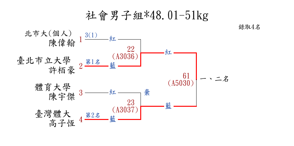 | 304 | 社會男子組*48.01-51kg ( 4取4 ) 圖 | 第 1 名 | [] 臺北市立大學 {臺北市立大學} | 許栢豪 | |