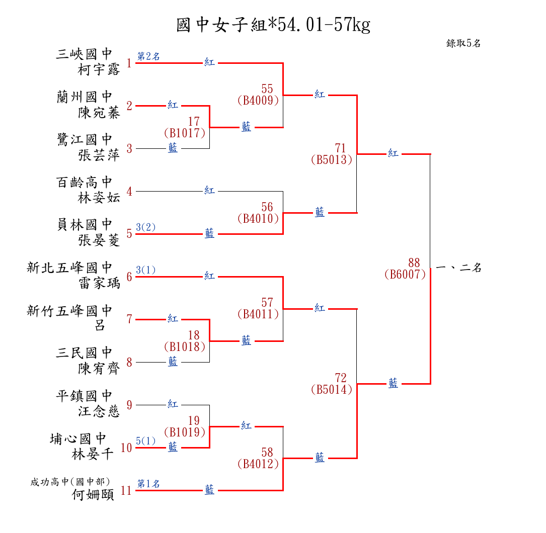 | 36 | 國中女子組*54.01-57㎏ ( 11取5 ) 圖 | 第 1 名 | [] 成功高中(國中部) {彰化縣立成功高中(國中部)} | 何姍頤 | |