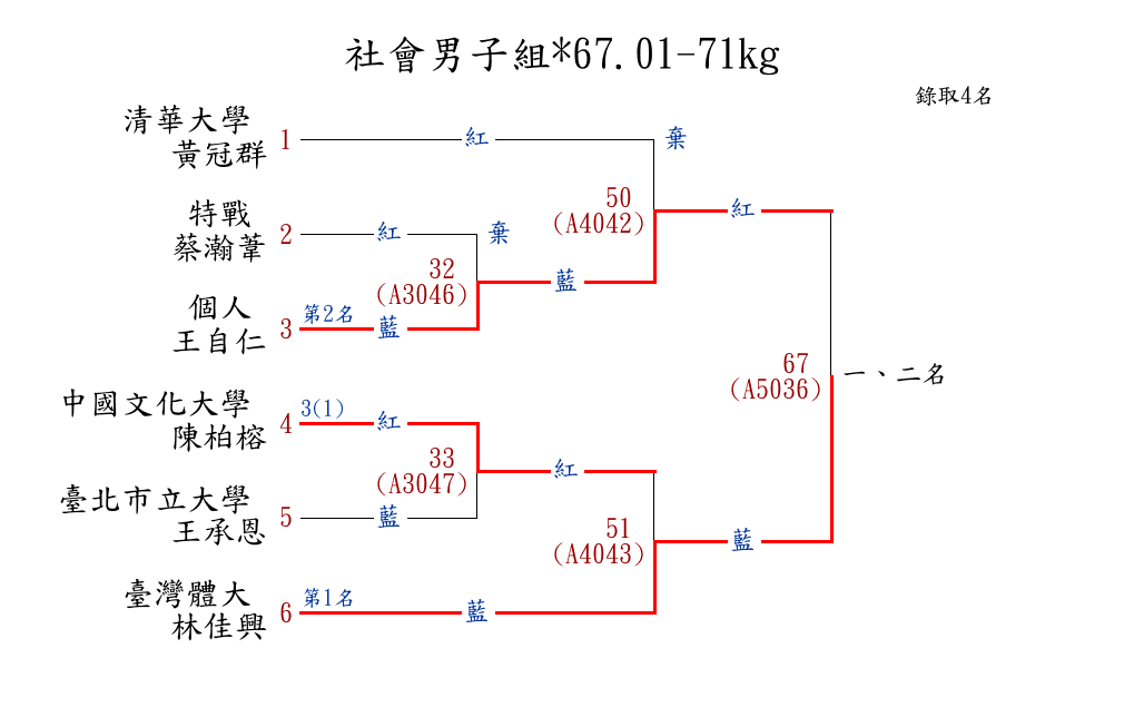 | 329 | 社會男子組*67.01-71kg ( 6取4 ) 圖 | 第 1 名 | [] 臺灣體大 {國立臺灣體育運動大學} | 林佳興 | |