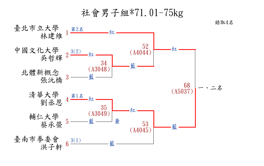 | 332 | 社會男子組*71.01-75kg ( 6取4 ) 圖 | 第 1 名 | [] 清華大學 {國立清華大學} | 劉丞恩 | |