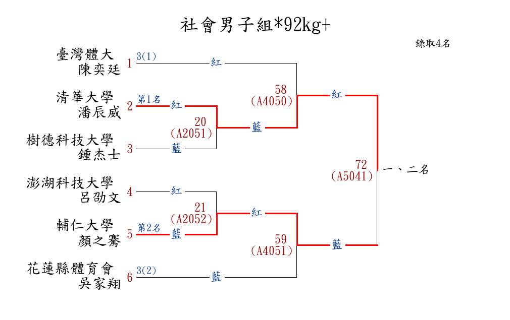 | 344 | 社會男子組*92kg+ ( 6取4 ) 圖 | 第 1 名 | [] 清華大學 {國立清華大學} | 潘辰威 | |