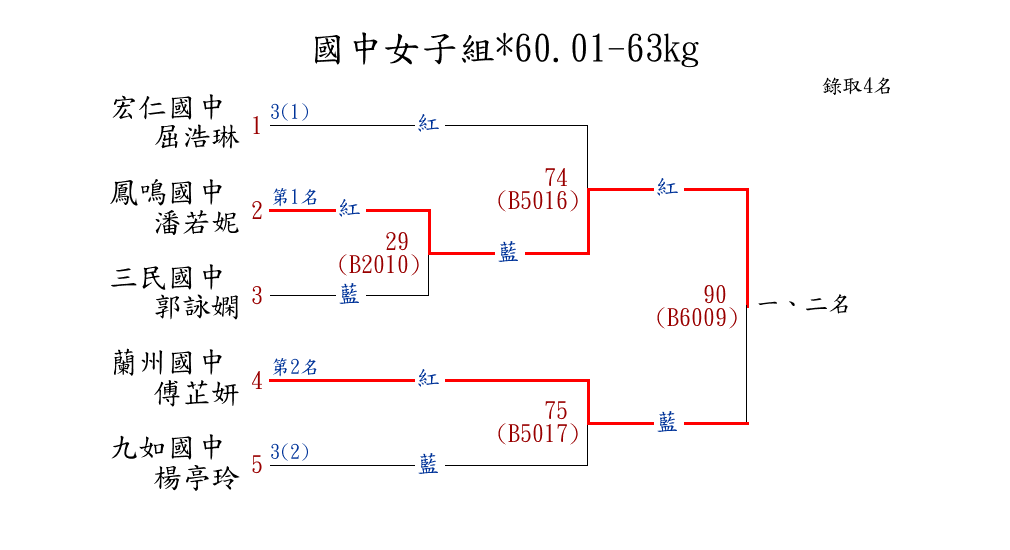 | 44 | 國中女子組*60.01-63㎏ ( 5取4 ) 圖 | 第 1 名 | [] 鳳鳴國中 {新北市立鳳鳴國民中學} | 潘若妮 | |