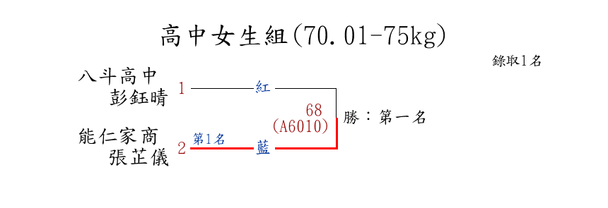 | 48 | 高中女生組(70.01-75kg) ( 2取1 ) 圖 | 第 1 名 | [能仁] 能仁家商 {新北市私立能仁家商} | 張芷儀 | |