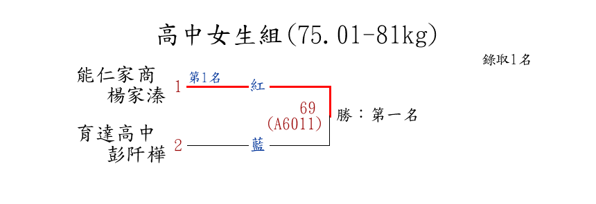 | 49 | 高中女生組(75.01-81kg) ( 2取1 ) 圖 | 第 1 名 | [能仁] 能仁家商 {新北市私立能仁家商} | 楊家溱 | |