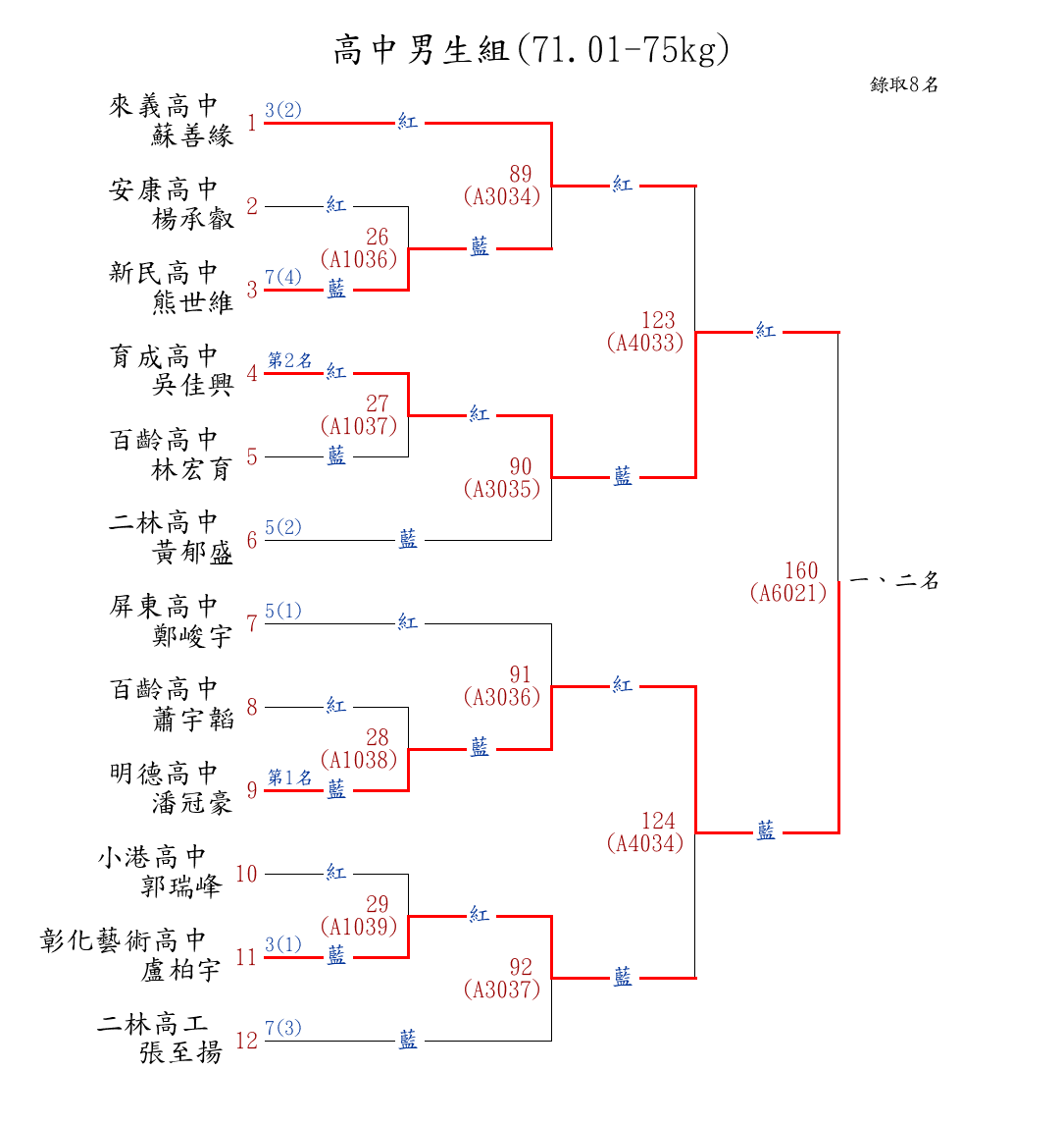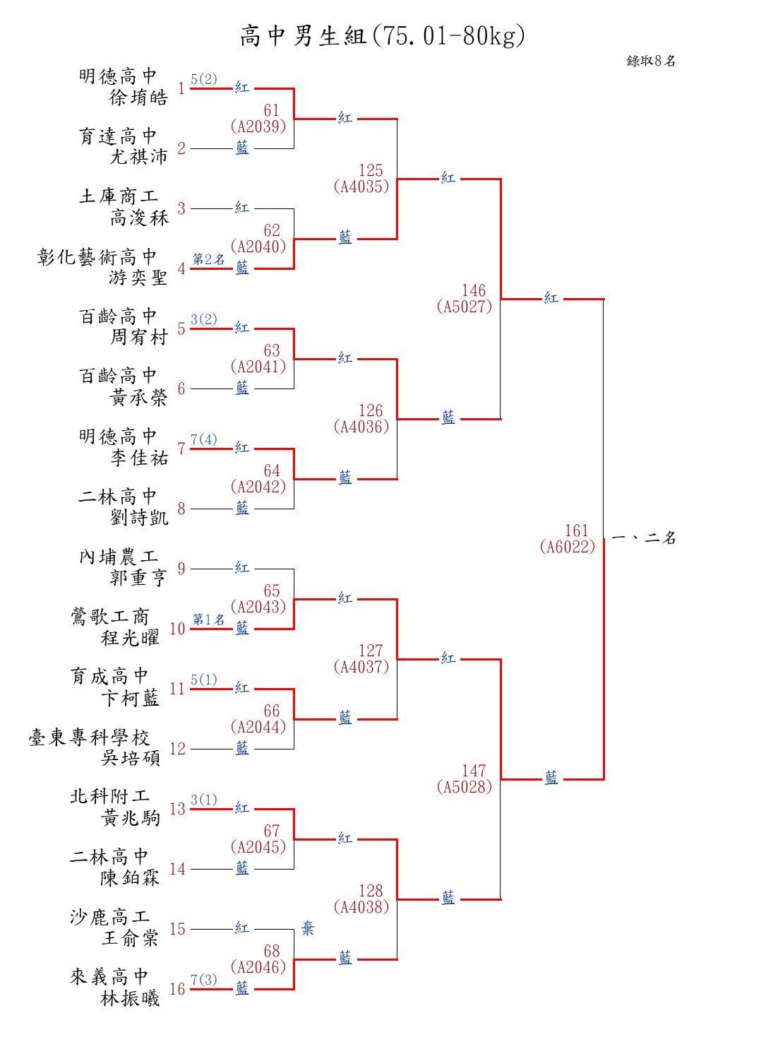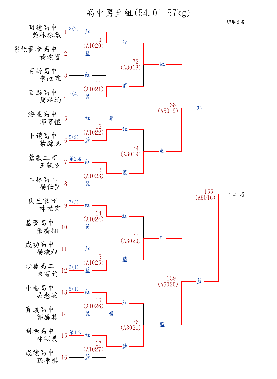 | 74 | 高中男生組(54.01-57kg) ( 16取8 ) 圖 | 第 1 名 | [明德] 明德高中 {新北市市立明德高中} | 林翊晟 | |