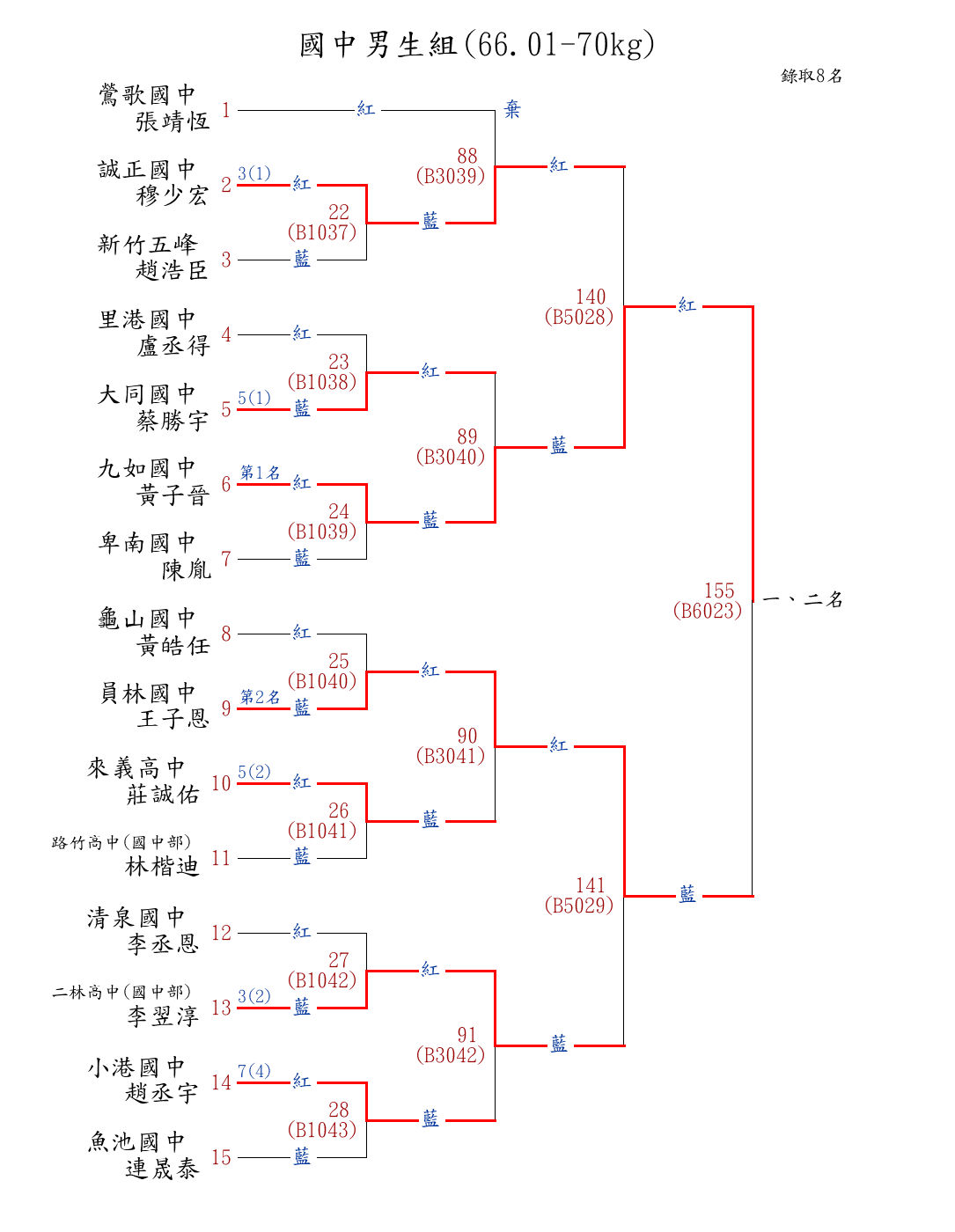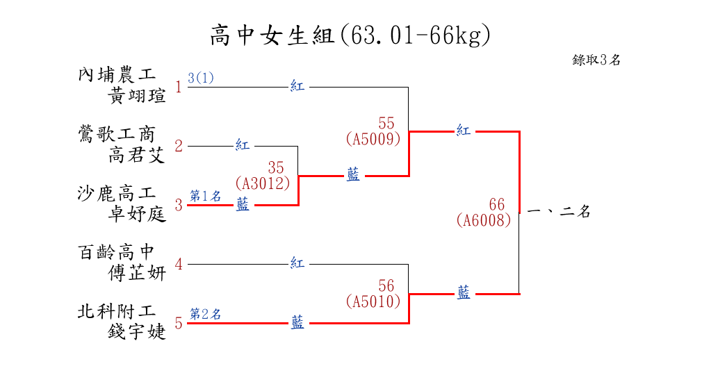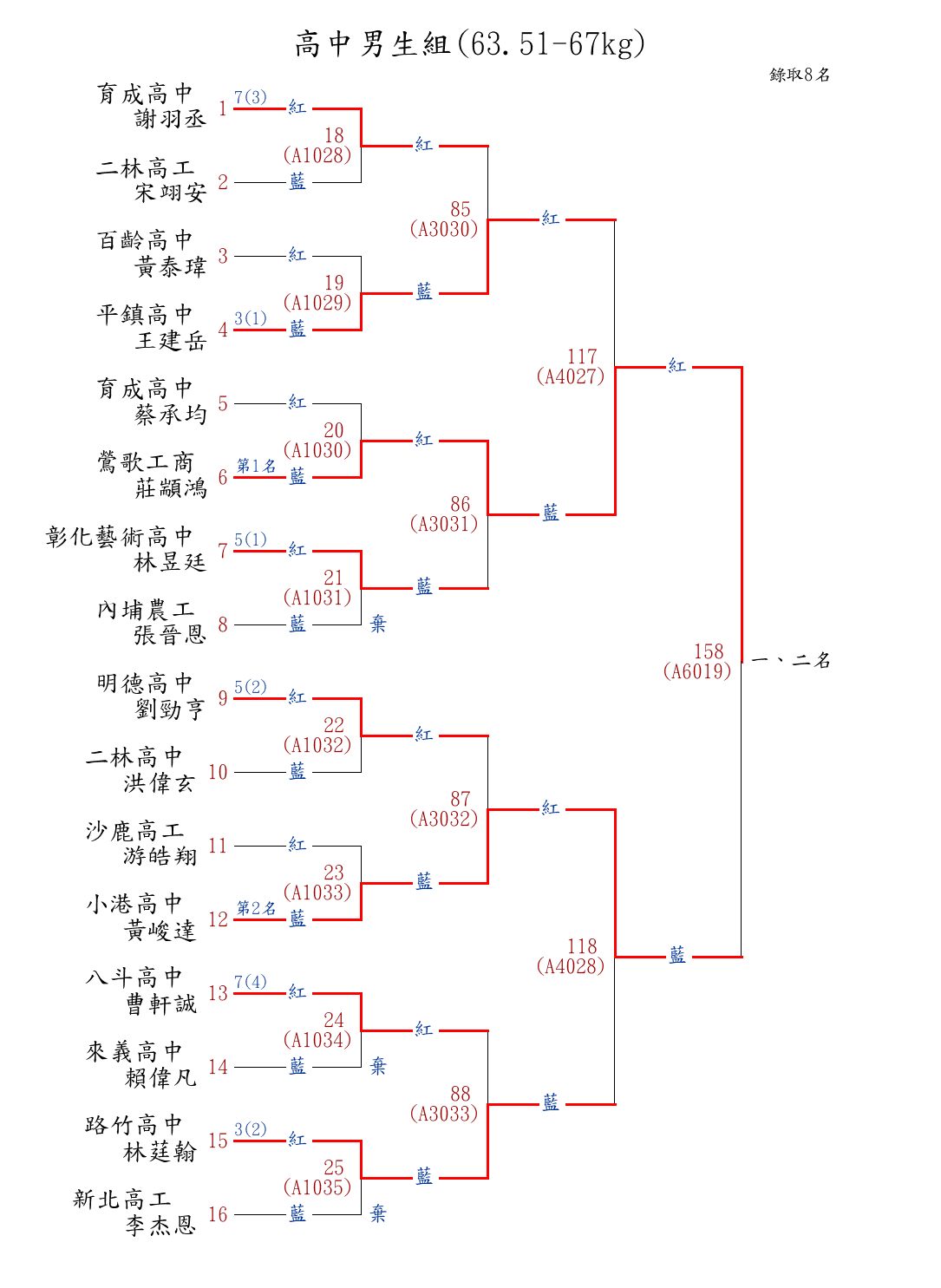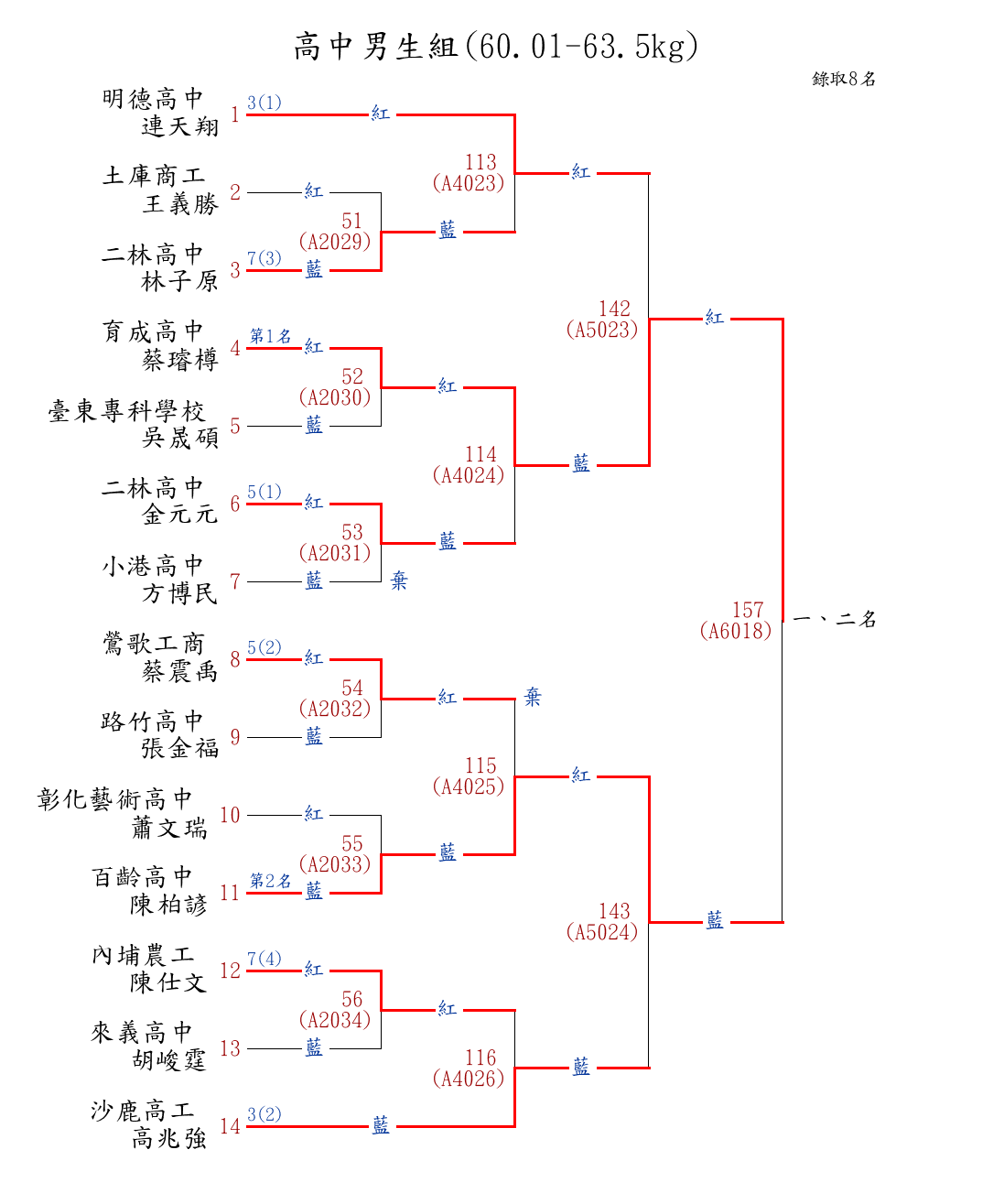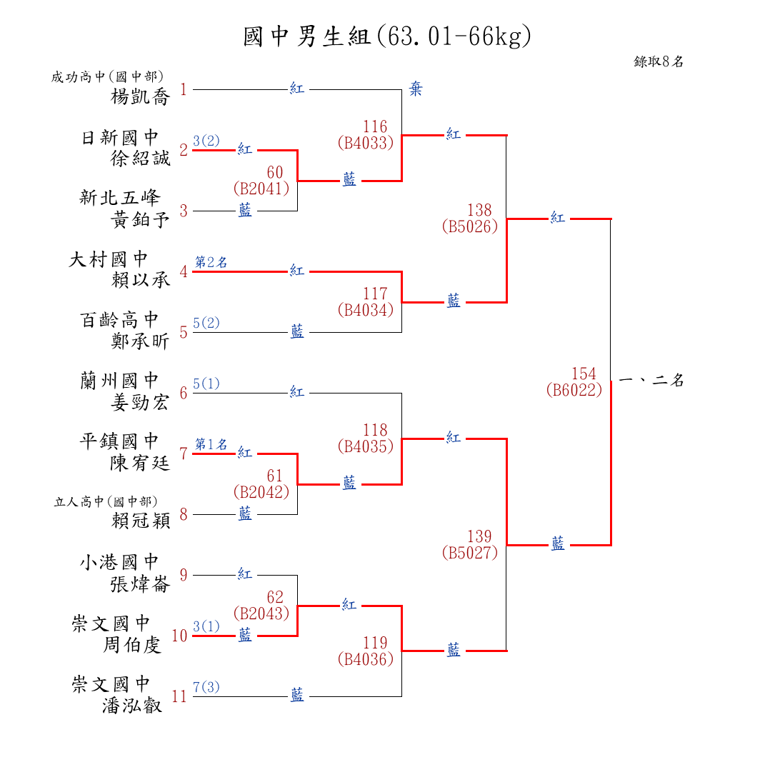 | 66 | 高中男生組(51.01-54kg) ( 17取8 ) 圖 | 第 1 名 | [來義] 來義高中 {屏東縣縣立來義高中} | 胡耀鈞 | |