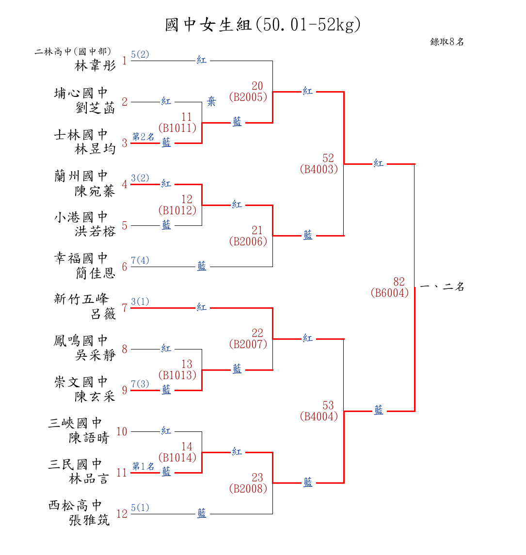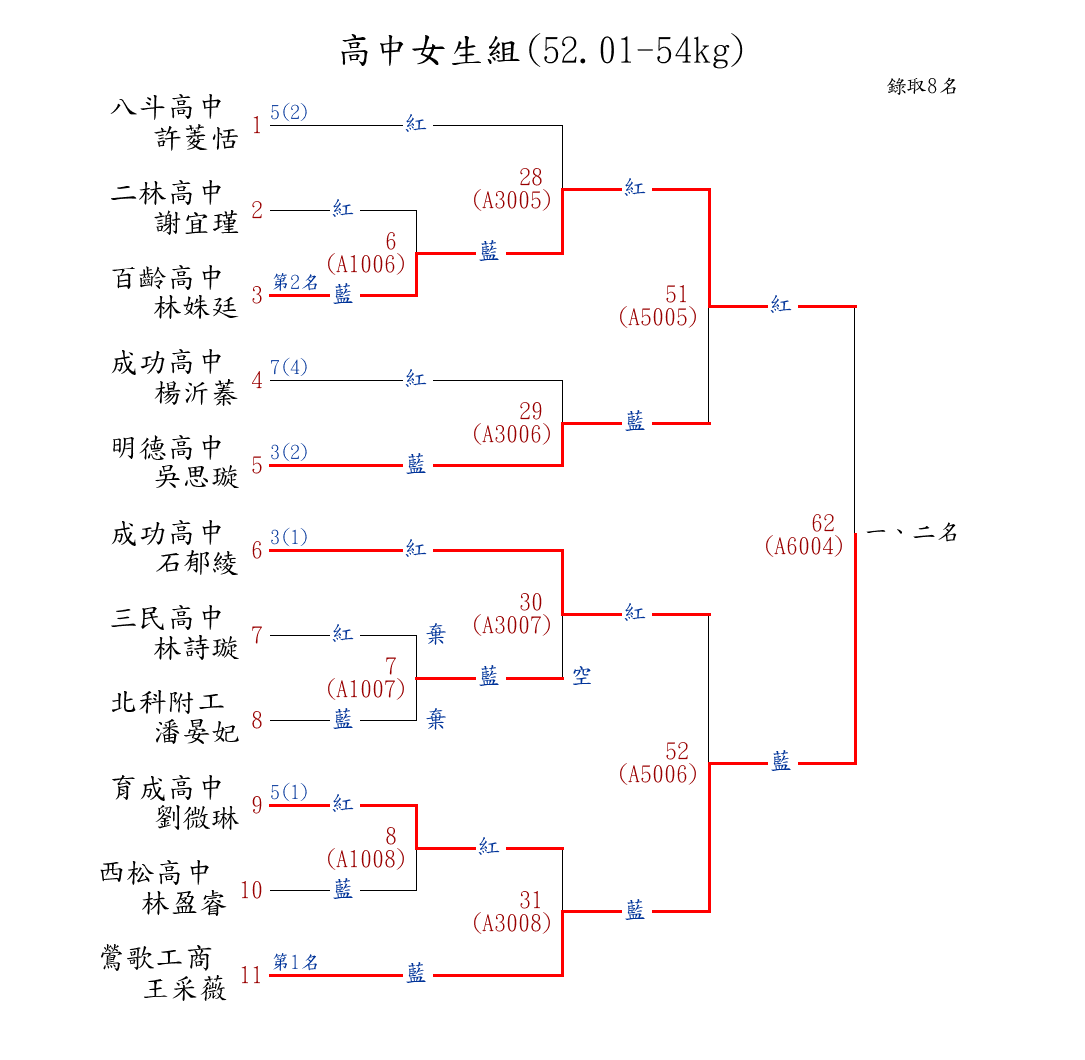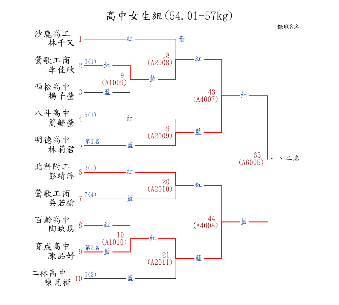 | 20 | 高中女生組(52.01-54kg) ( 11取8 ) 圖 | 第 1 名 | [鶯工] 鶯歌工商 {新北市市立鶯歌工商} | 王采薇 | |