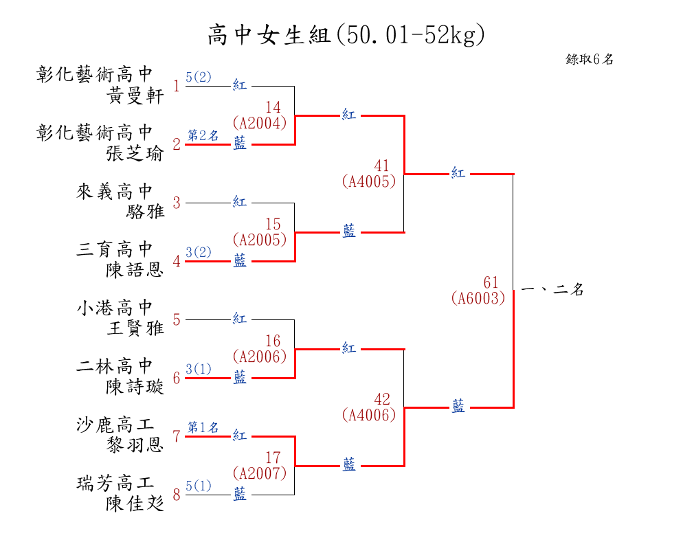 | 14 | 高中女生組(50.01-52kg) ( 8取6 ) 圖 | 第 1 名 | [沙工] 沙鹿高工 {臺中市市立沙鹿高工} | 黎羽恩 | |