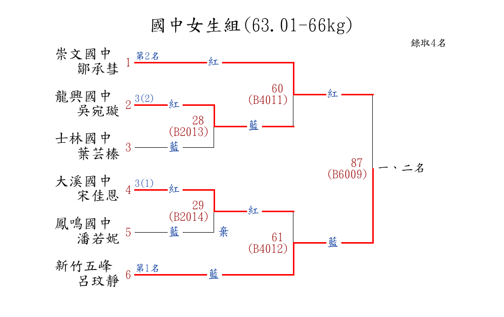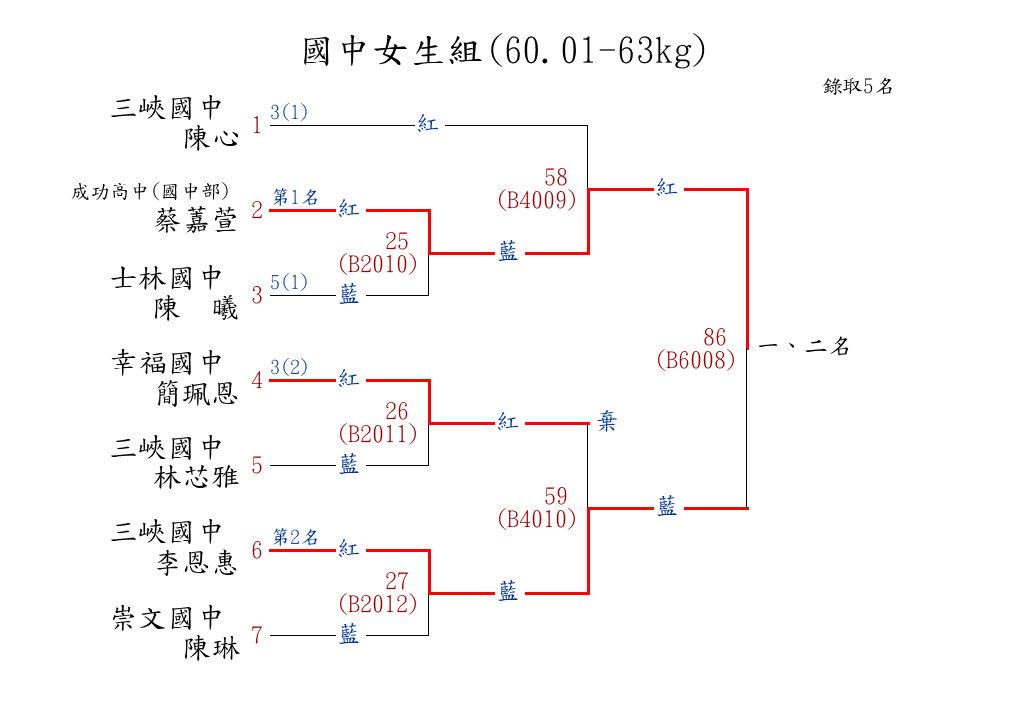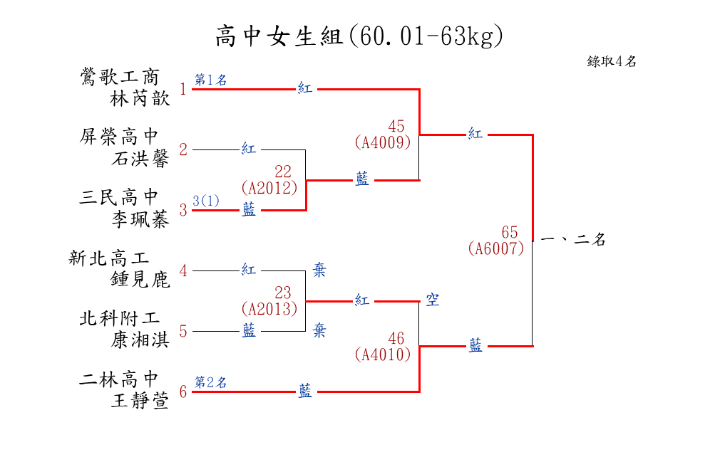 | 39 | 高中女生組(60.01-63kg) ( 6取4 ) 圖 | 第 1 名 | [鶯工] 鶯歌工商 {新北市市立鶯歌工商} | 林芮歆 | |