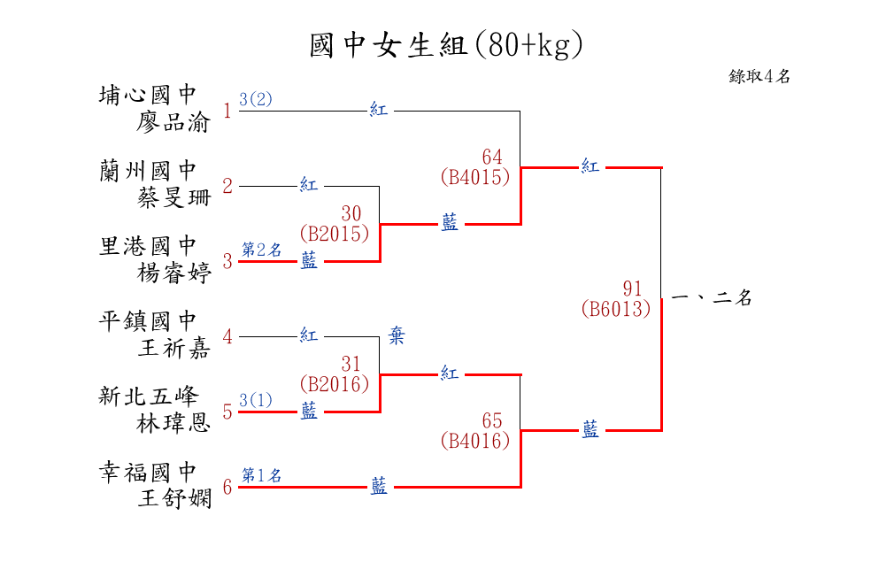 | 214 | 國中女生組(80+kg) ( 6取4 ) 圖 | 第 1 名 | [幸福] 幸福國中 {桃園市市立幸福國中} | 王舒嫻 | |