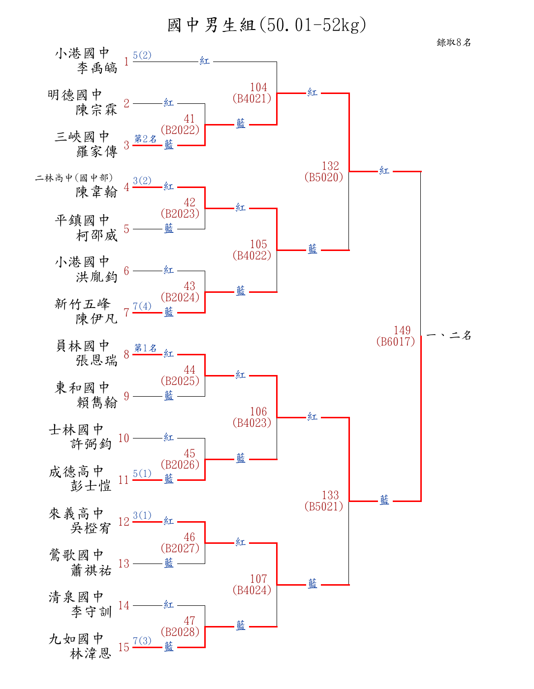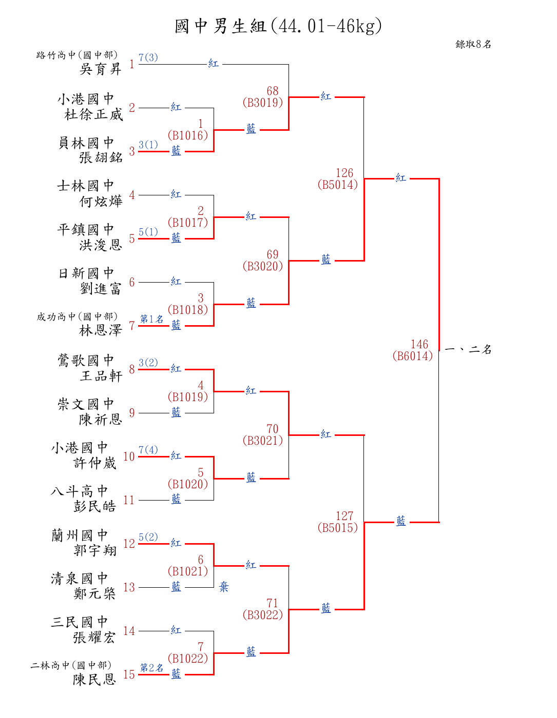 | 218 | 國中男生組(44.01-46kg) ( 15取8 ) 圖 | 第 1 名 | [成功] 成功高中(國中部) {彰化縣縣立成功高中} | 林恩澤 | |
