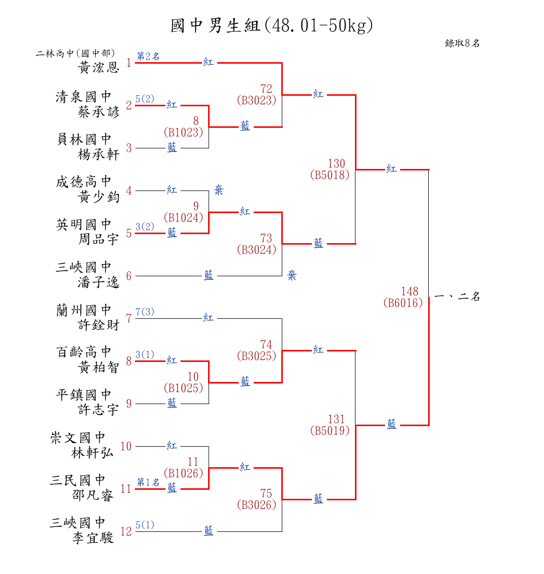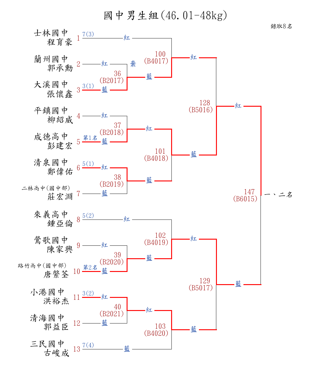 | 226 | 國中男生組(46.01-48kg) ( 13取8 ) 圖 | 第 1 名 | [成德] 成德高中 {新竹市市立成德高中} | 彭建宏 | |