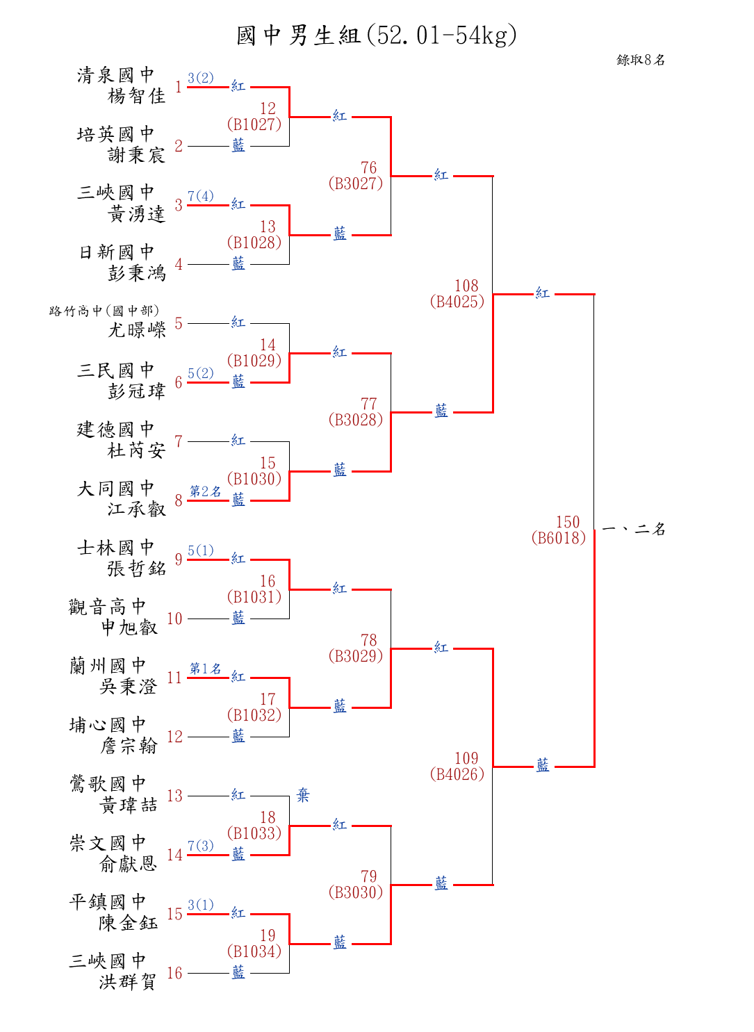| 249 | 國中男生組(52.01-54kg) ( 16取8 ) 圖 | 第 1 名 | [蘭州] 蘭州國中 {臺北市市立蘭州國中} | 吳秉澄 | |