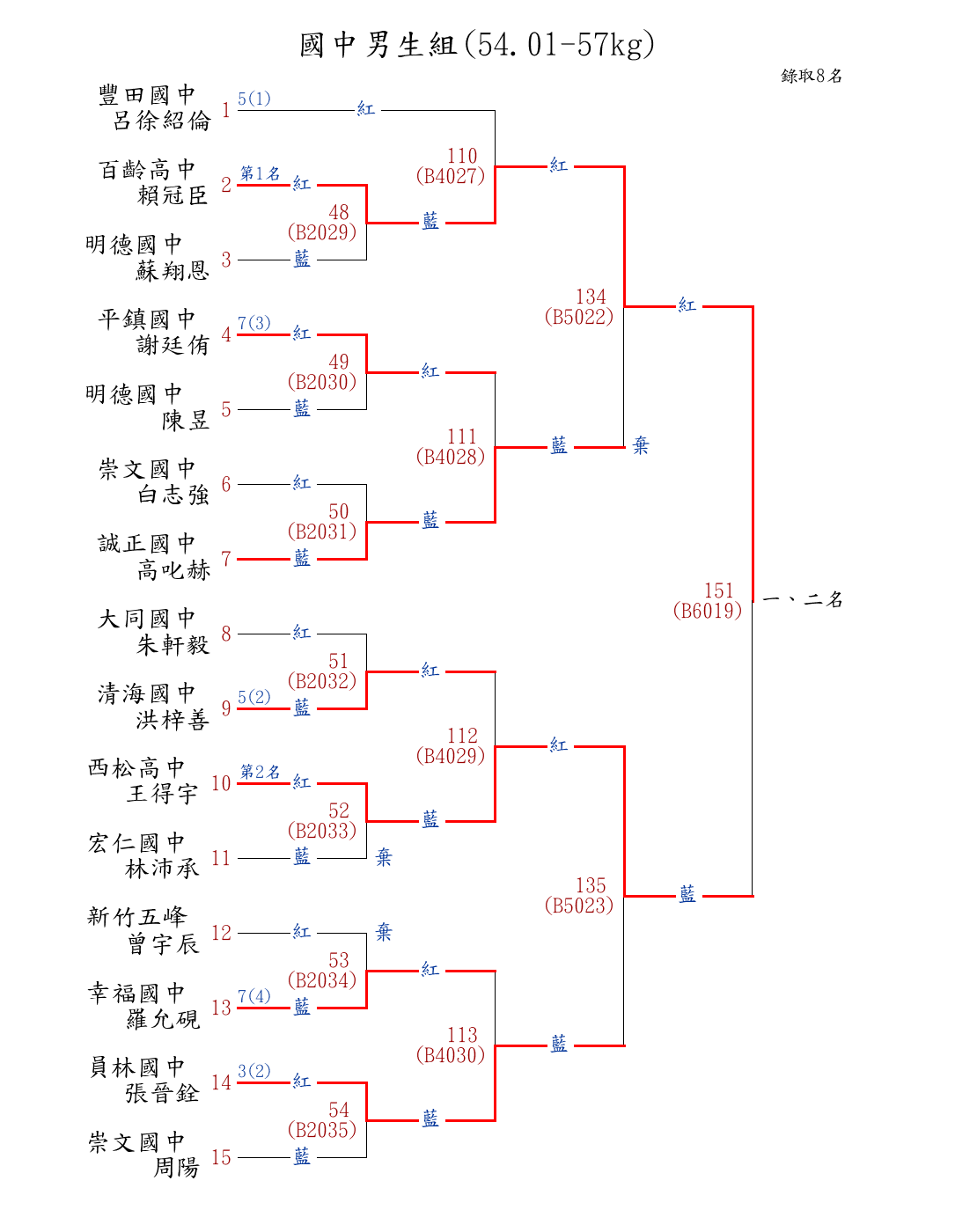 | 257 | 國中男生組(54.01-57kg) ( 15取8 ) 圖 | 第 1 名 | [百齡] 百齡高中 {臺北市市立百齡高中} | 賴冠臣 | |