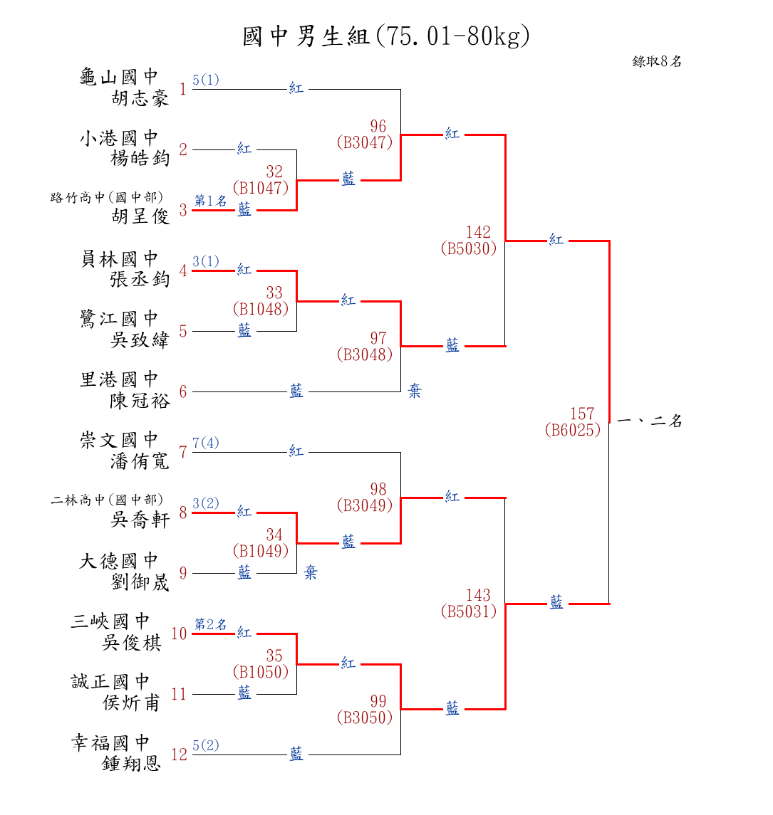 | 298 | 國中男生組(75.01-80kg) ( 12取8 ) 圖 | 第 1 名 | [路竹] 路竹高中(國中部) {高雄市市立路竹高中} | 胡呈俊 | |