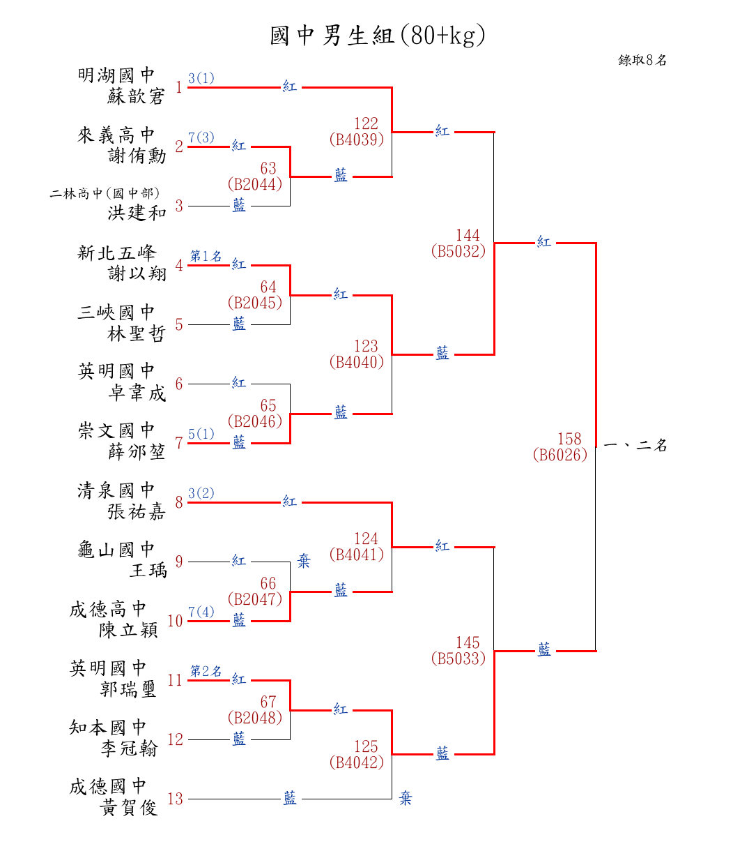 | 305 | 國中男生組(80+kg) ( 13取8 ) 圖 | 第 1 名 | [北五] 新北五峰 {新北市市立五峰國中} | 謝以翔 | |