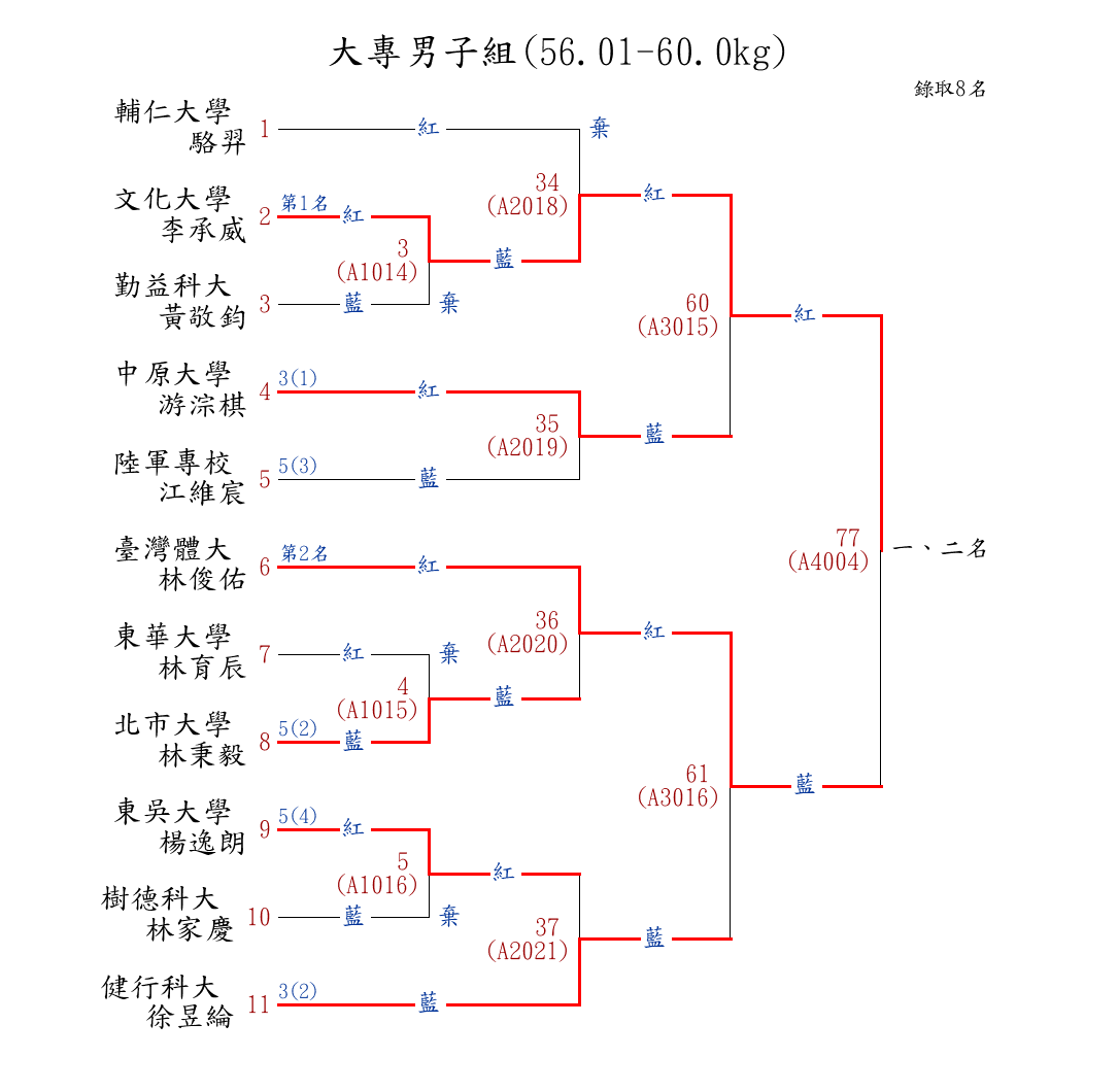 38大專男子組(56.01-60.0kg) ( 11取8 ) 圖 第 1 名[文化] 文化大學 {中國文化大學}李承威