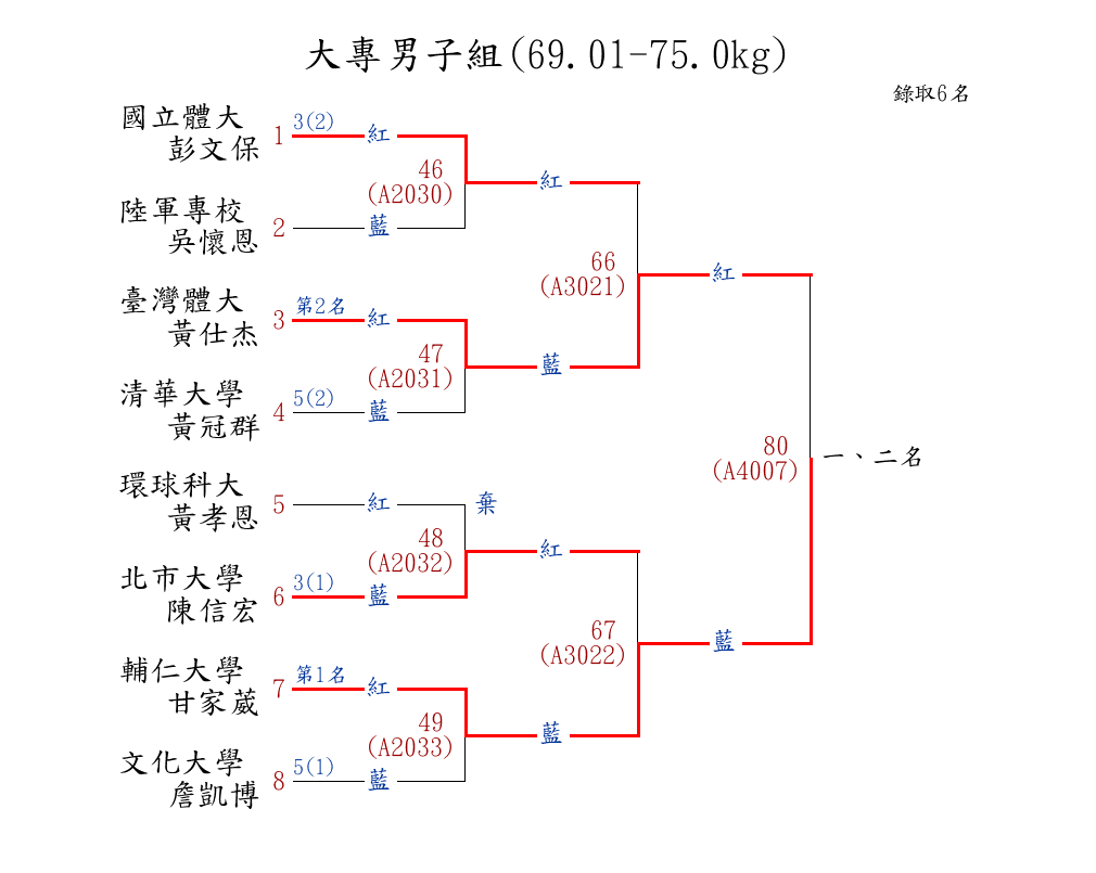 61大專男子組(69.01-75.0kg) ( 8取6 ) 圖 第 1 名[輔仁] 輔仁大學 {輔仁大學}甘家葳