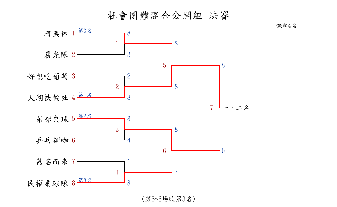 分組預賽+單敗淘汰 社會團體混合公開組 12隊,選 4名