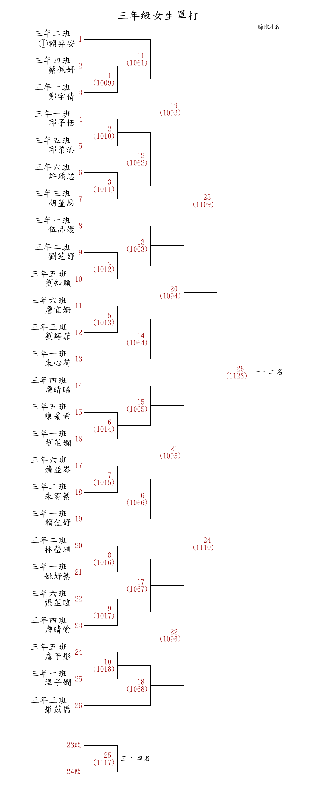 | 1009 | 比賽準備中 | 三年級女生單打 圖 | #1 | 三年四班 - 蔡佩妤 | | 三年一班 - 鄭宇倩 |